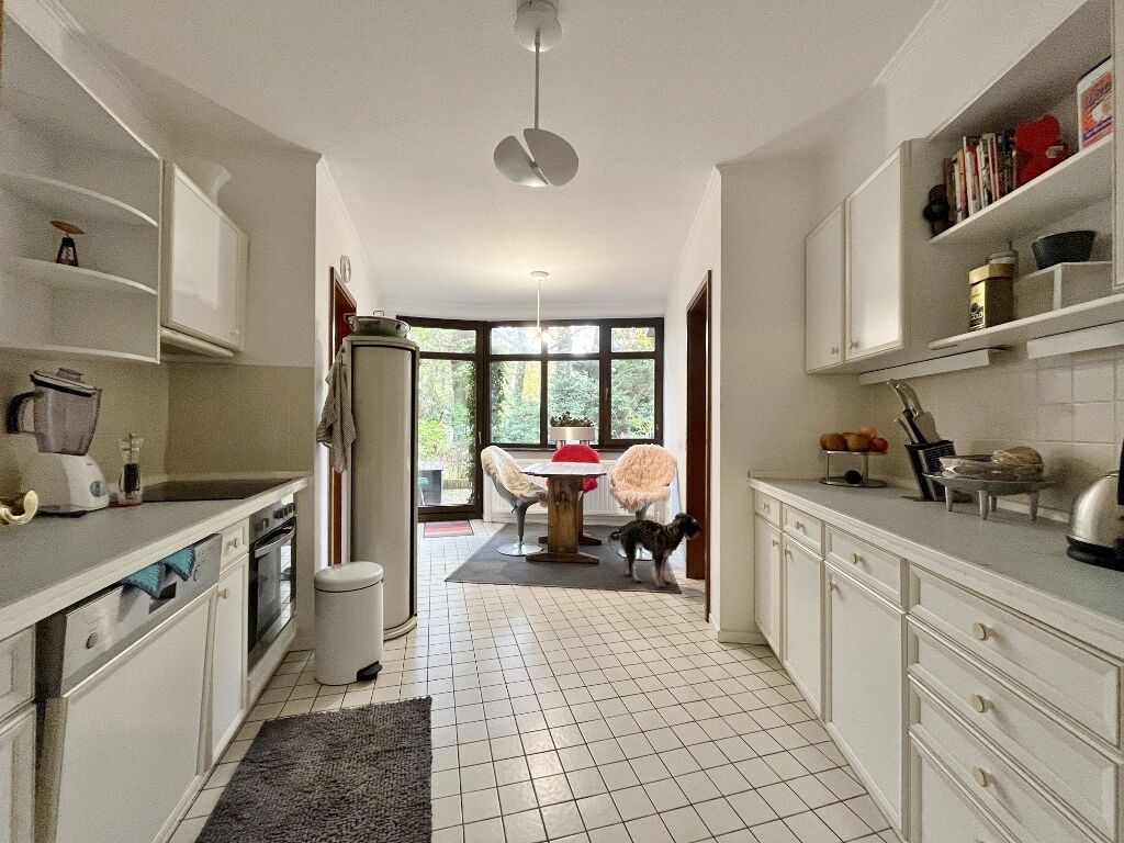 Der großzügige Dielenbereich sowie die Küche sind mittig in der Wohnung angeordnet und somit wird die ca. 15 m² große Küche mit ihrem schönen Essplatz vor einer großen Fensterfront zu einem Mittelpunkt der Wohnung. Der Blick ins Grüne ist Ihnen von hier garantiert und der direkte Zugang zur Terrasse ist ebenfalls gegeben. Ob Sie die Sonne oder den Schatten des alten Baumbestandes genießen möchten, die Terrasse bietet Ihnen alle Möglichkeiten.