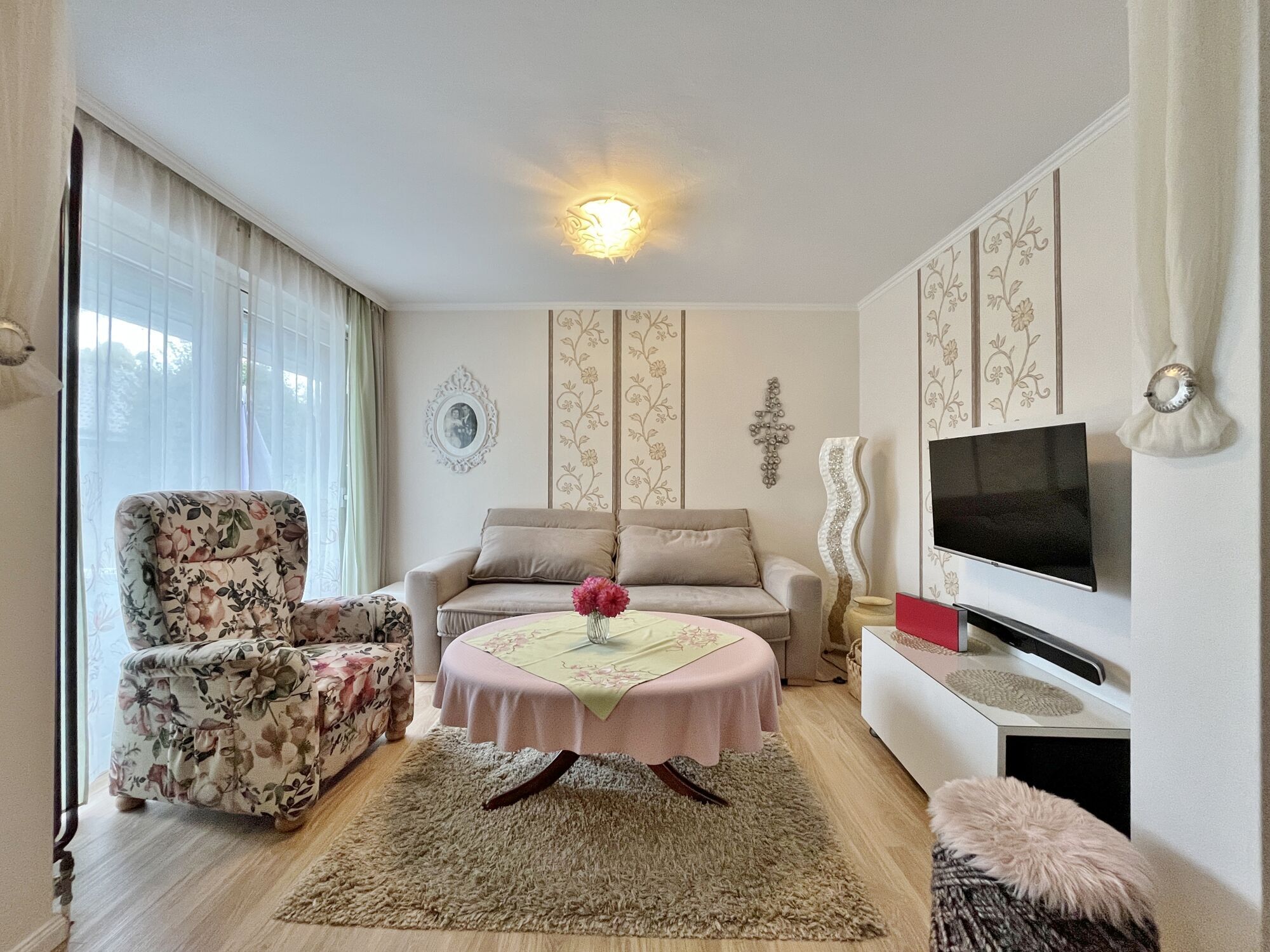 Im Erdgeschoss empfängt Sie ein freundlicher Eingangsbereich, der in den hellen und großzügigen Wohn- und Essbereich mit ca. 33 m² führt. Durch die große Fensterfront entsteht eine angenehme Wohnatmosphäre mit viel Tageslicht und einem schönen Blick in den gepflegten Garten.