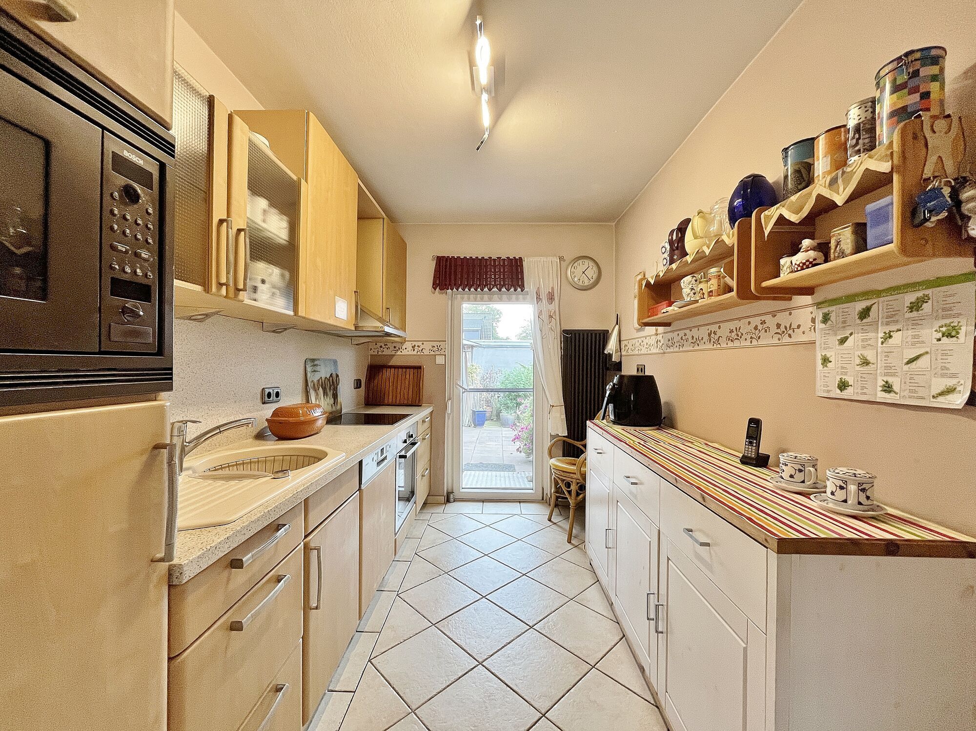 Die voll ausgestattete Küche verfügt über einen praktischen Außenzugang sowie Platz für einen angrenzenden Essbereich. Von hier aus gelangen Sie direkt auf die Terrasse, die sowohl sonnige als auch schattige Bereiche bietet – ideal für gemütliche Stunden im Freien.