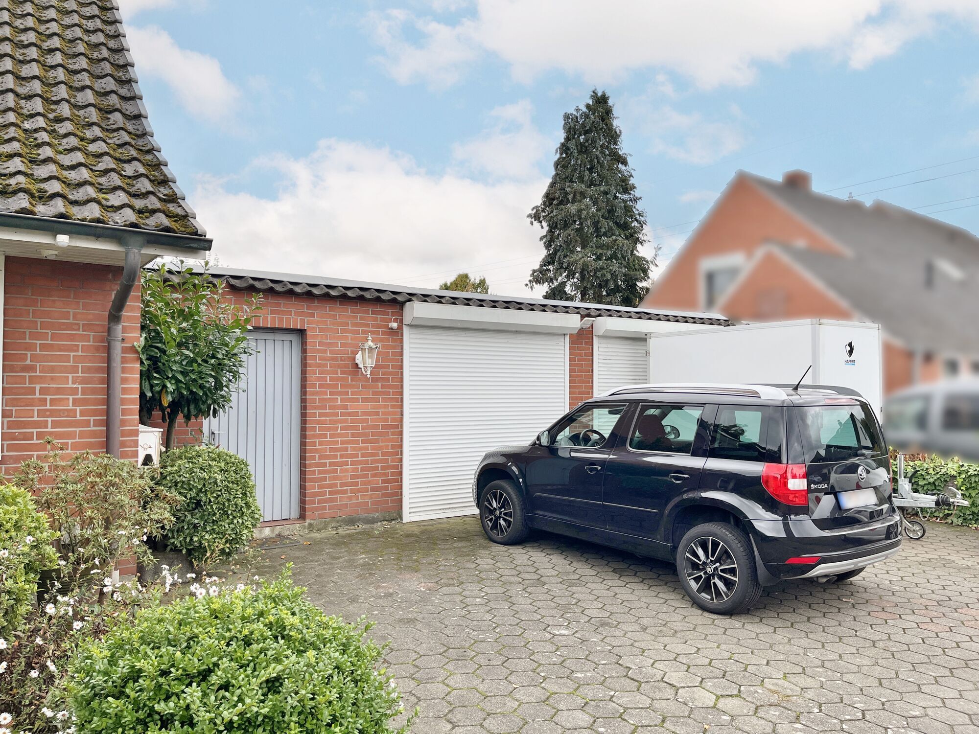 Der pflegeleicht angelegte Garten bietet ausreichend Platz für Freizeitaktivitäten und ist mit einem Gartenhaus ausgestattet, das zusätzlichen Stauraum oder Platz für Hobbys bietet. Eine Doppelgarage rundet das Angebot ab und ermöglicht komfortables Parken direkt am Haus.