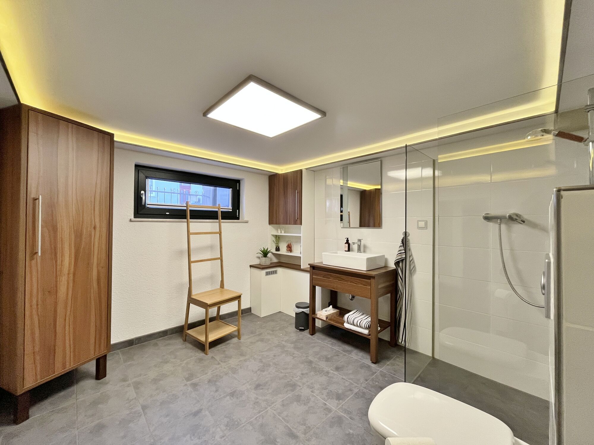 Ein besonderes Highlight befindet sich im Kellergeschoss: Hier wurde ein überraschend geräumiges, modernes Duschbad mit ebenerdiger Dusche und Frischluftzufuhr eingerichtet. Ergänzt wird diese Ebene durch weitere Räume für Vorräte sowie das Unterbringen einer Waschmaschine.