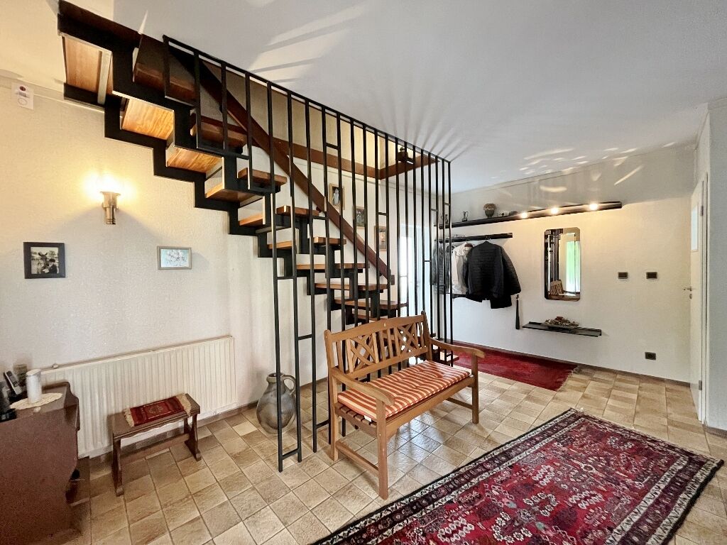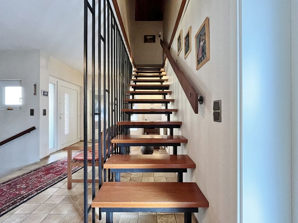 Die Diele beeindruckt mit ihrer Großzügigkeit und der offenen Treppe in Holz-Metall-Konstruktion, die in die obere Etage führt. Fliesenböden sorgen für eine pflegeleichte und stilvolle Umgebung.