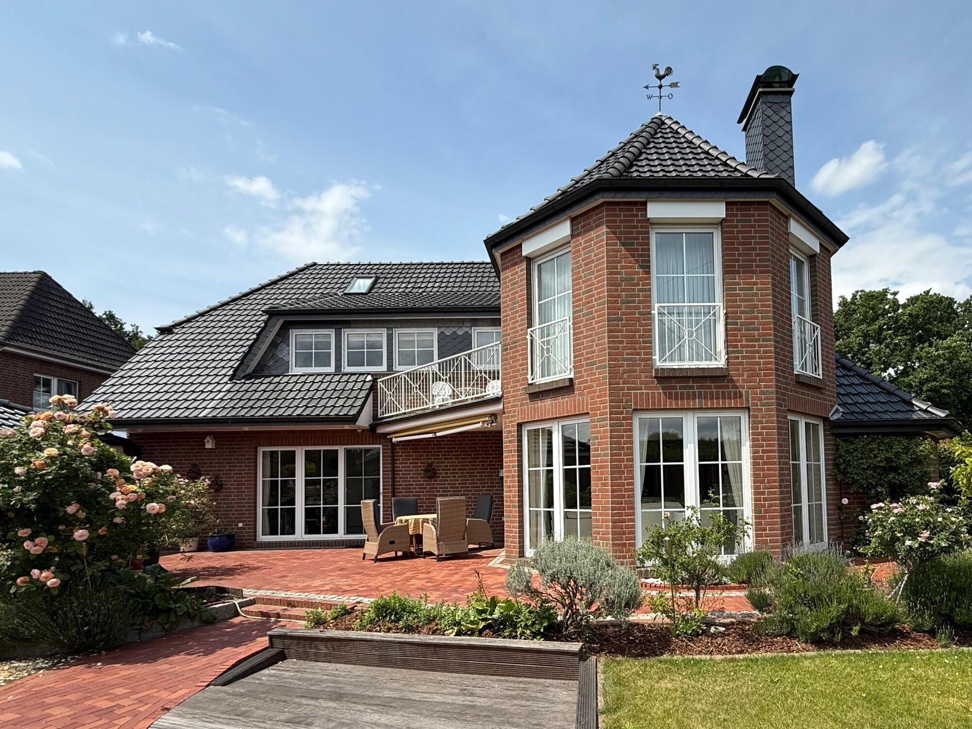 Bereits von außen vermittelt die verklinkerte Fassade im klassischen Rot, eingebettet in ein rund 894 m² großes Grundstück mit gepflegter Bepflanzung, ein einladendes Bild. Das elegante Eingangstor und die gesäumten Beete verstärken den repräsentativen Charakter.
