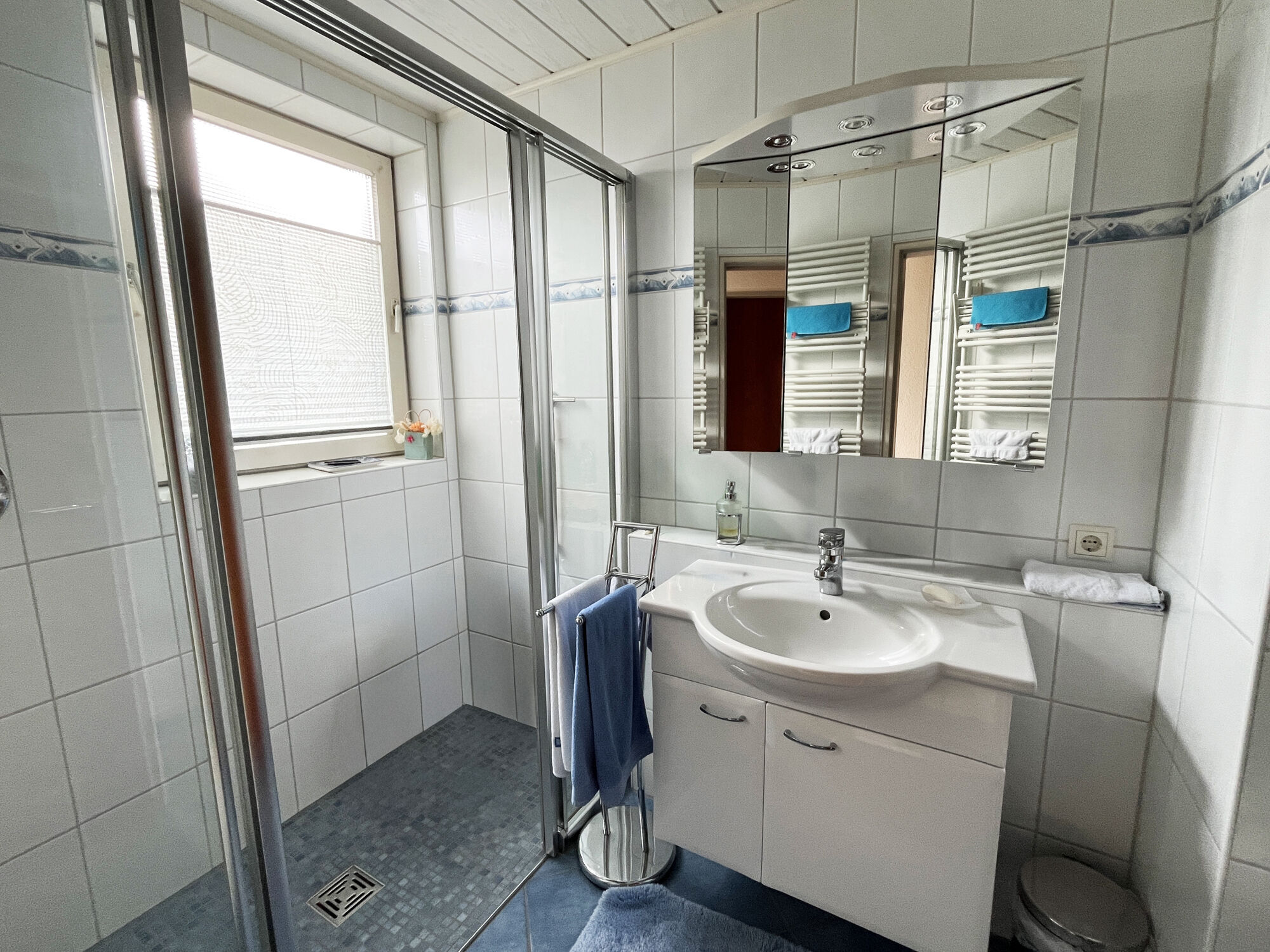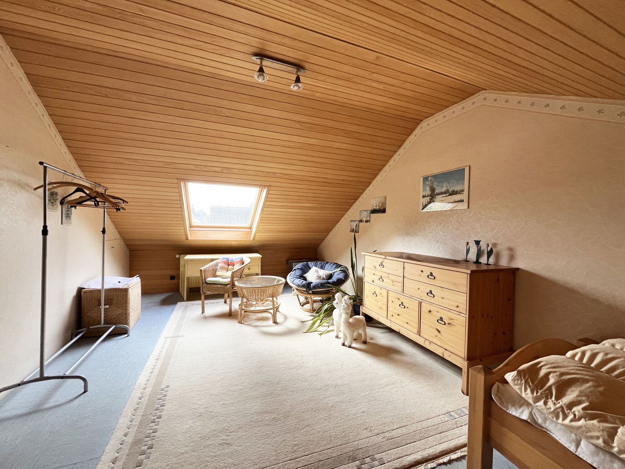 Das ausgebaute Dachgeschoss erreichen Sie über eine offene Holztreppe. Hier erwarten Sie ein Flur und zwei großzügige, von Dachschrägen geprägte Räume mit holzvertäfelten Decken. Ein zusätzliches Badezimmer mit Dusche, WC und Waschbecken ist hier vorhanden.