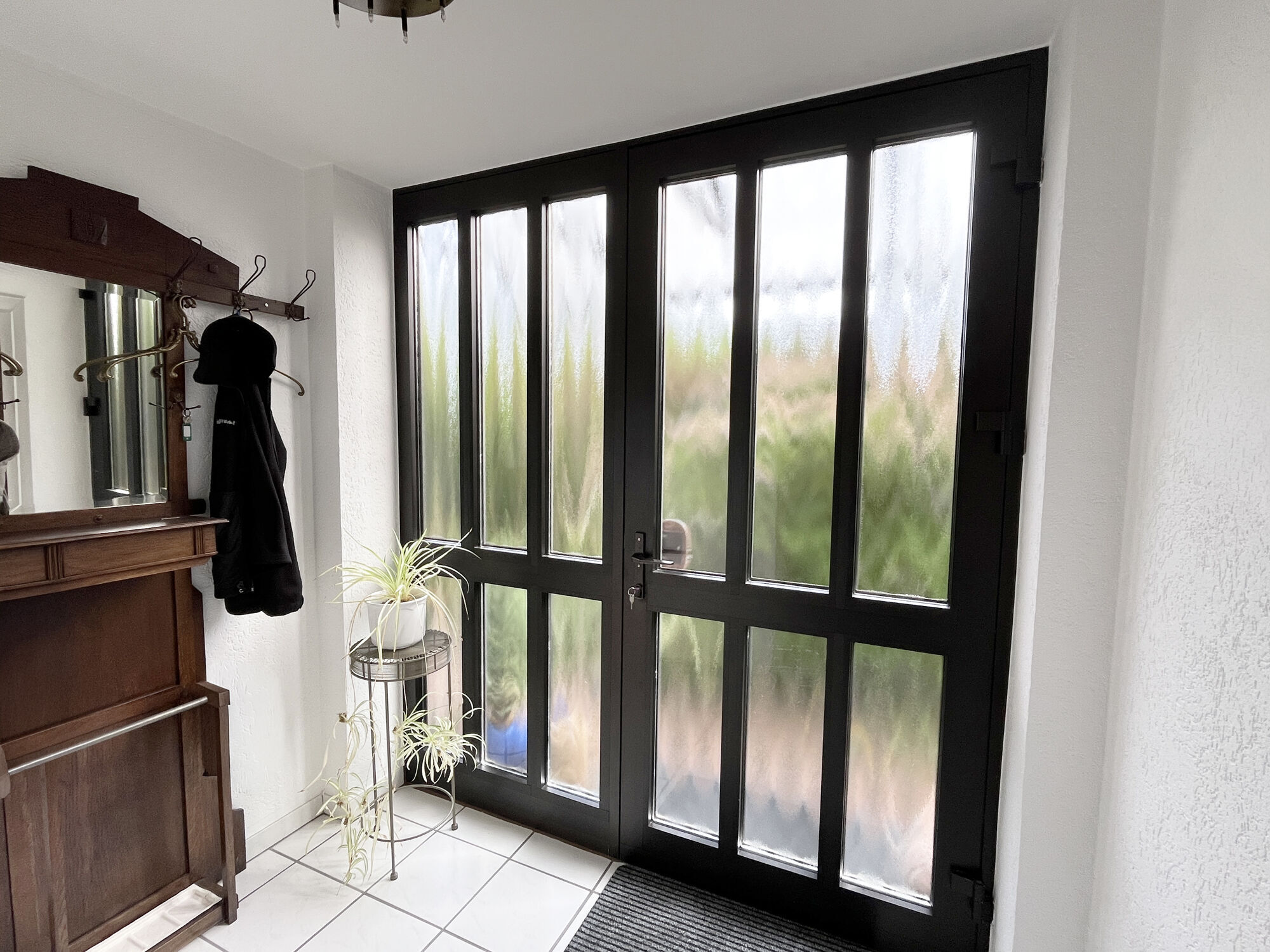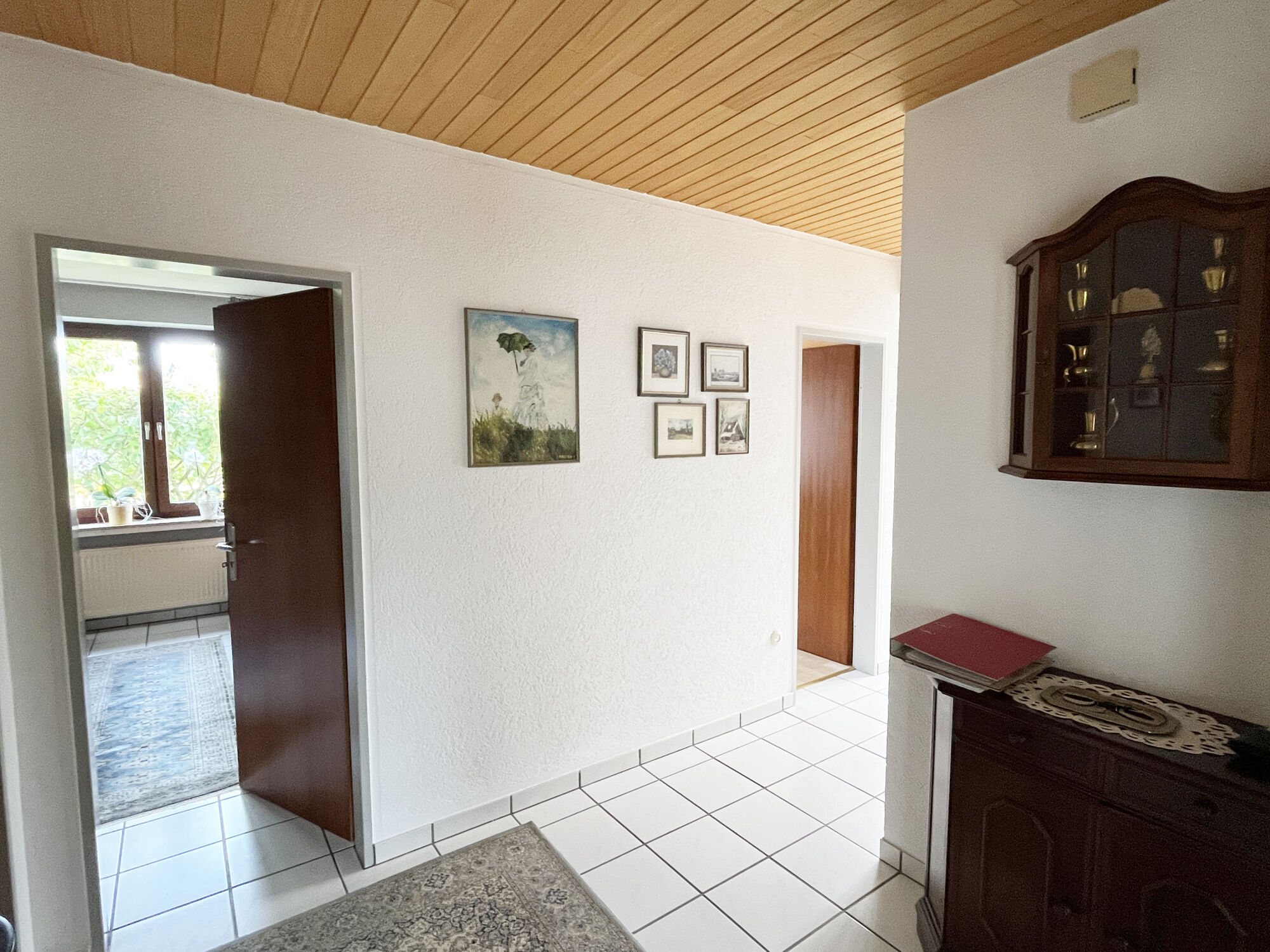 Ein liebevoll angelegter Vorgarten führt zum Eingang. Der helle Windfang bietet Platz für eine Garderobe und erschließt ein modernisiertes Duschbad – praktisch nach Gartenarbeit oder an warmen Tagen. Daran schließt sich eine großzügige Diele an, von der aus alle Räume erreichbar sind.