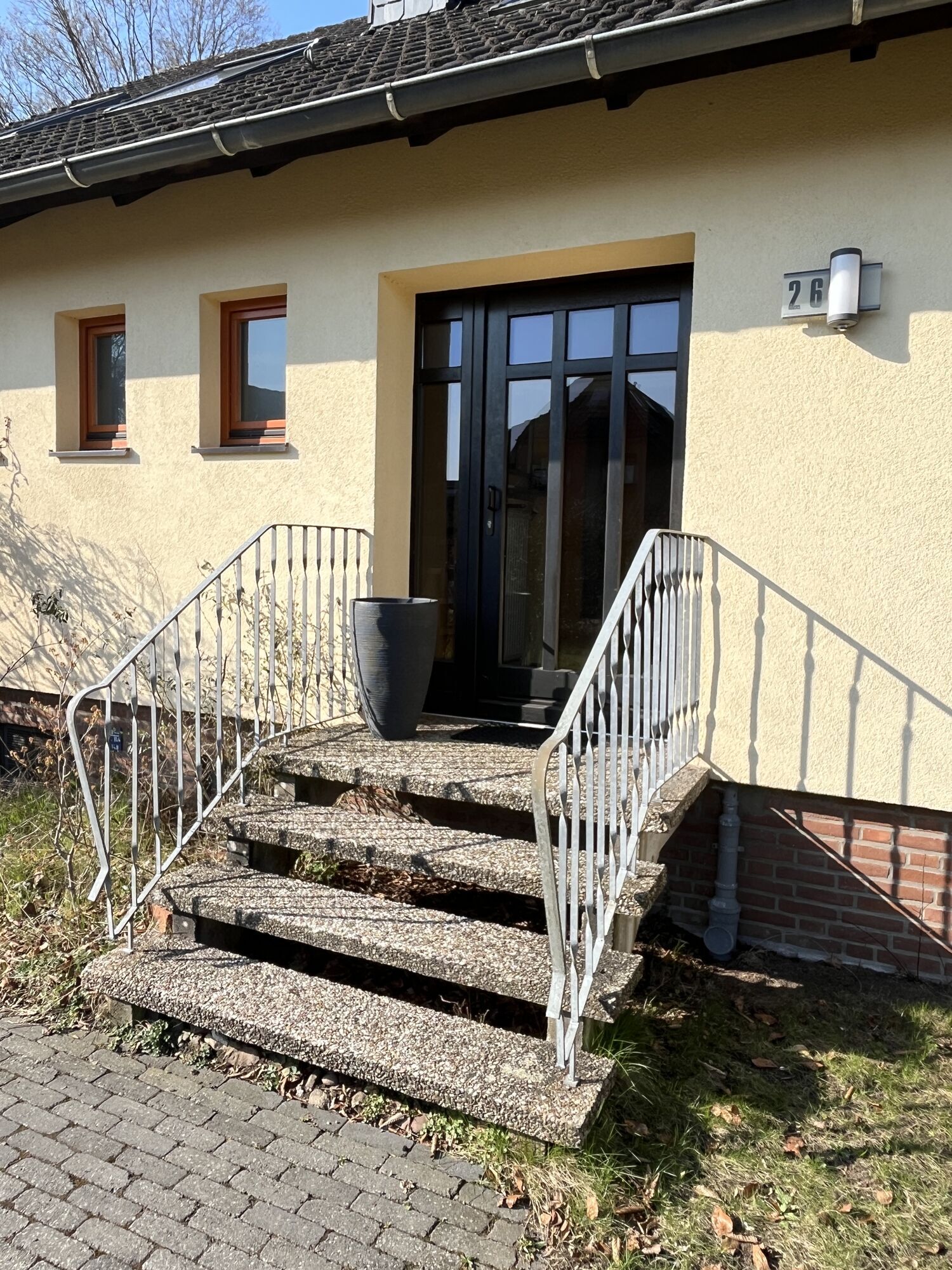 Der einladende Eingangsbereich mit vorgelagerter Treppenanlage verleiht dem Haus einen repräsentativen Empfang. Die helle Fassadengestaltung in Kombination mit den warmen Fensterrahmen, klaren Dachlinien und markantem Schornstein unterstreicht den charmanten Charakter der Immobilie und sorgt für einen gepflegten Gesamteindruck. Dachflächenfenster und großzügige Fensterflächen lassen viel Tageslicht in die Wohnräume fallen.