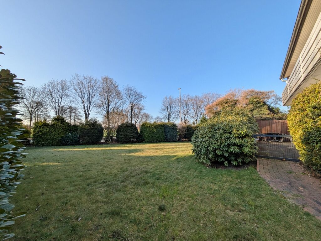 Eine breite Fensterfront führt auf die geschützte Terrasse, die Privatsphäre und Ruhe verspricht. Der weitläufige Garten, umrahmt von hohen Büschen, bietet die nötige Privatsphäre sowie eine große Rasenfläche zum Spielen und Entspannen.
