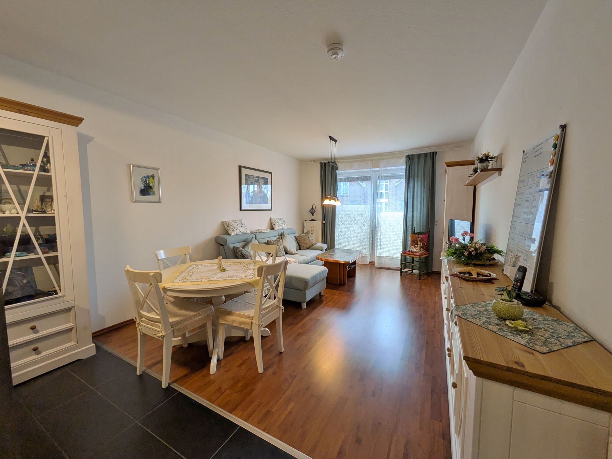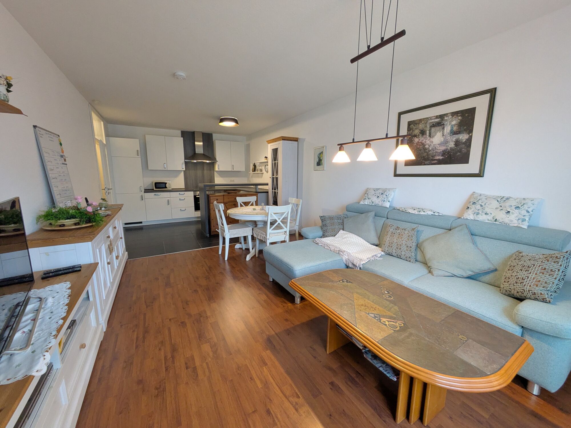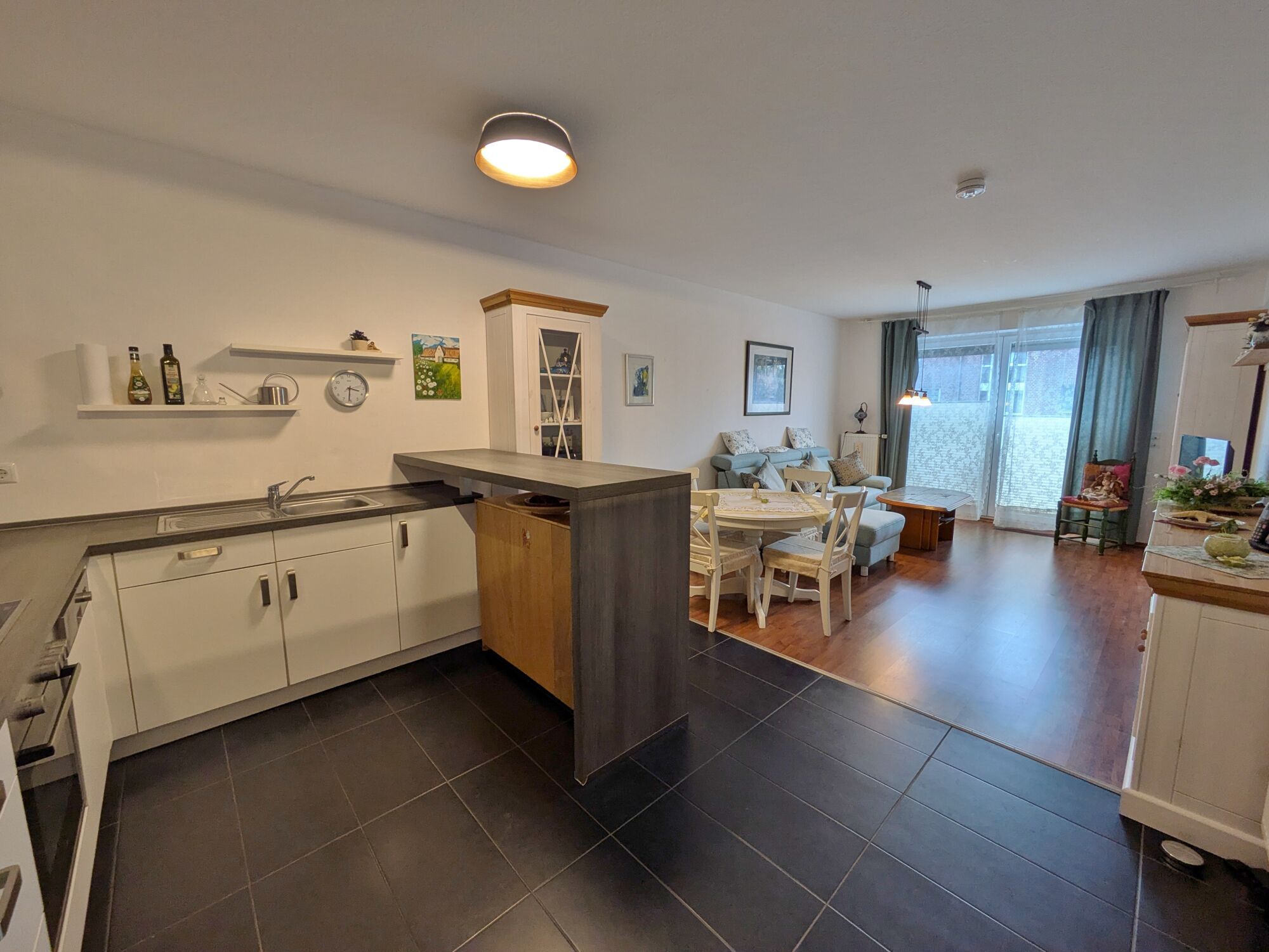 Der ca. 30 m² große Wohn- und Essbereich mit integrierter Küche ist das Herzstück der Wohnung. Die dunklen Fliesen im Kochbereich setzen einen stilvollen Akzent, während die gepflegte Einbauküche mit modernen Geräten keine Wünsche offen lässt. Ein Tresen lädt dazu ein, den ersten Kaffee des Tages in gemütlicher Atmosphäre zu genießen. Der Wohnbereich bietet ausreichend Platz für einen Esstisch, eine gemütliche Sitzlandschaft und einen Wohnzimmerschrank.