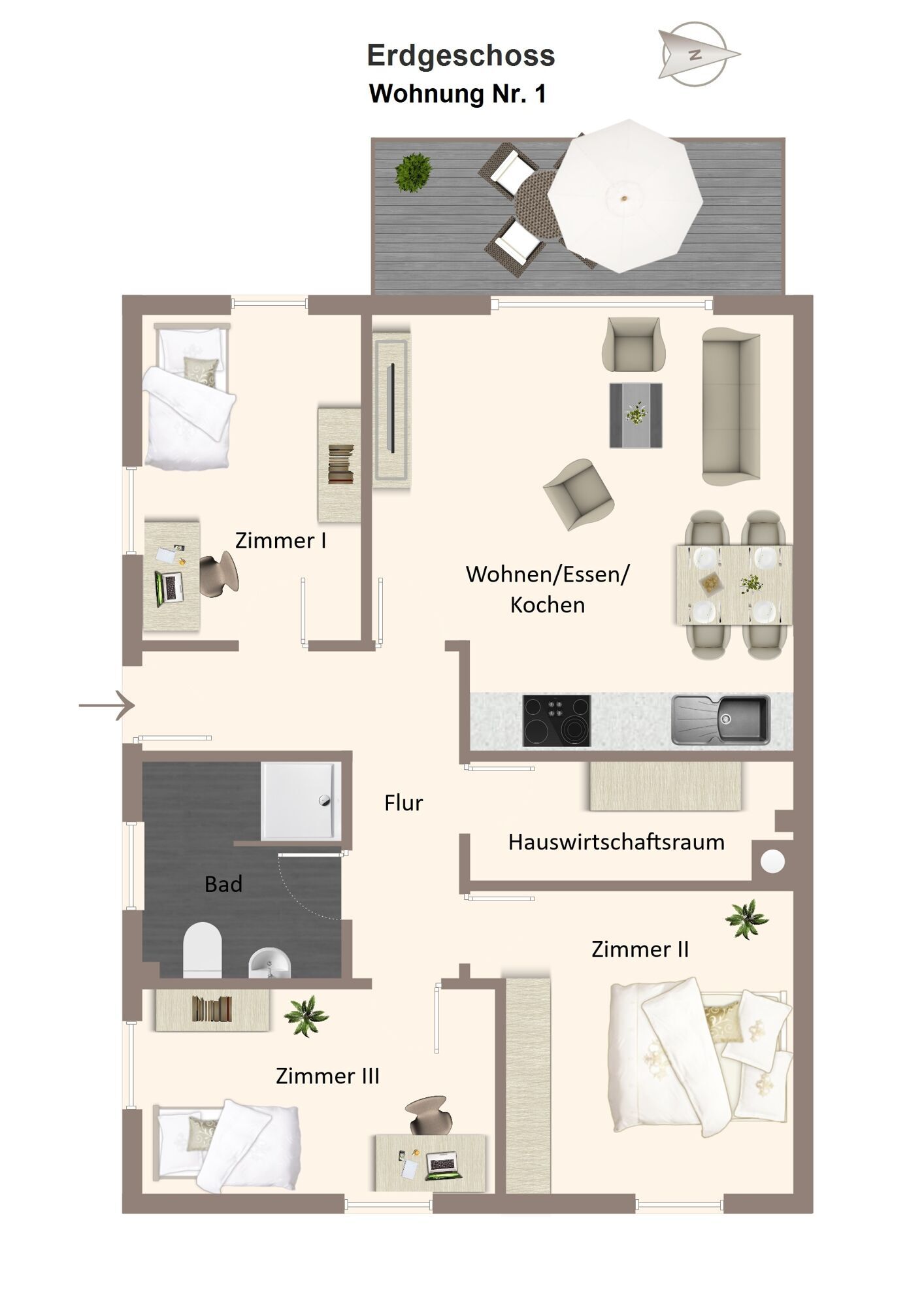 Die barrierefreie Gestaltung der Wohnung bietet Ihnen eine flexible Raumaufteilung. Drei Schlafzimmer warten darauf, nach Ihren Vorstellungen eingerichtet zu werden. Das großzügige Duschbad mit ebenerdiger Dusche lädt zum Entspannen ein. Ein praktischer Abstellraum mit Anschlüssen für Waschmaschine und Trockner ergänzt das Angebot. Die Küchenanschlüsse sind im offenen Wohnbereich integriert, wo Sie Ihre Traumküche verwirklichen können. Vom lichtdurchfluteten Wohnraum aus gelangen Sie direkt auf die Terrasse, die mit einem angrenzenden Gartenbereich viel Platz für Ihre kreativen Ideen bietet.