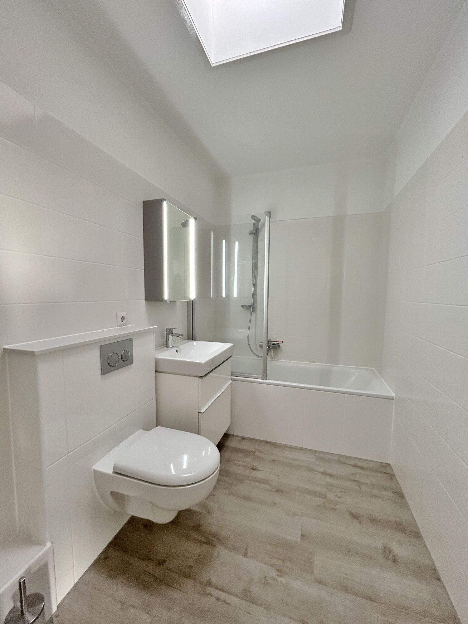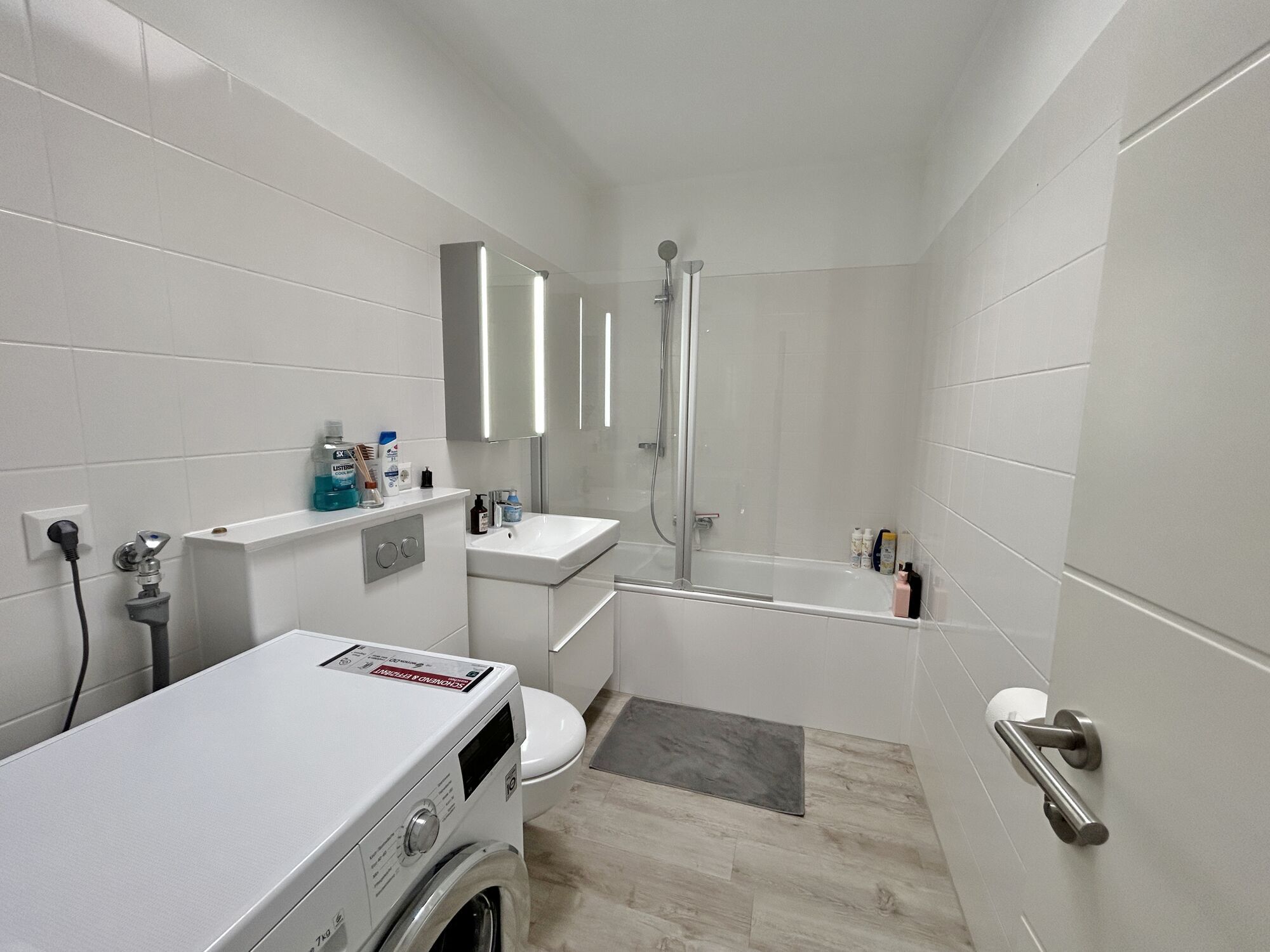 Das Bad ist mit einer Wanne ausgestattet und wie auch der Rest der Wohnung mit hochwertigem Vinylboden versehen, die Wandfliesen wurden weiß gestrichen und fügen sich somit ideal in das moderne Wohnungsdesign ein. Der Waschmaschinenanschluss befindet sich ebenfalls im Bad.