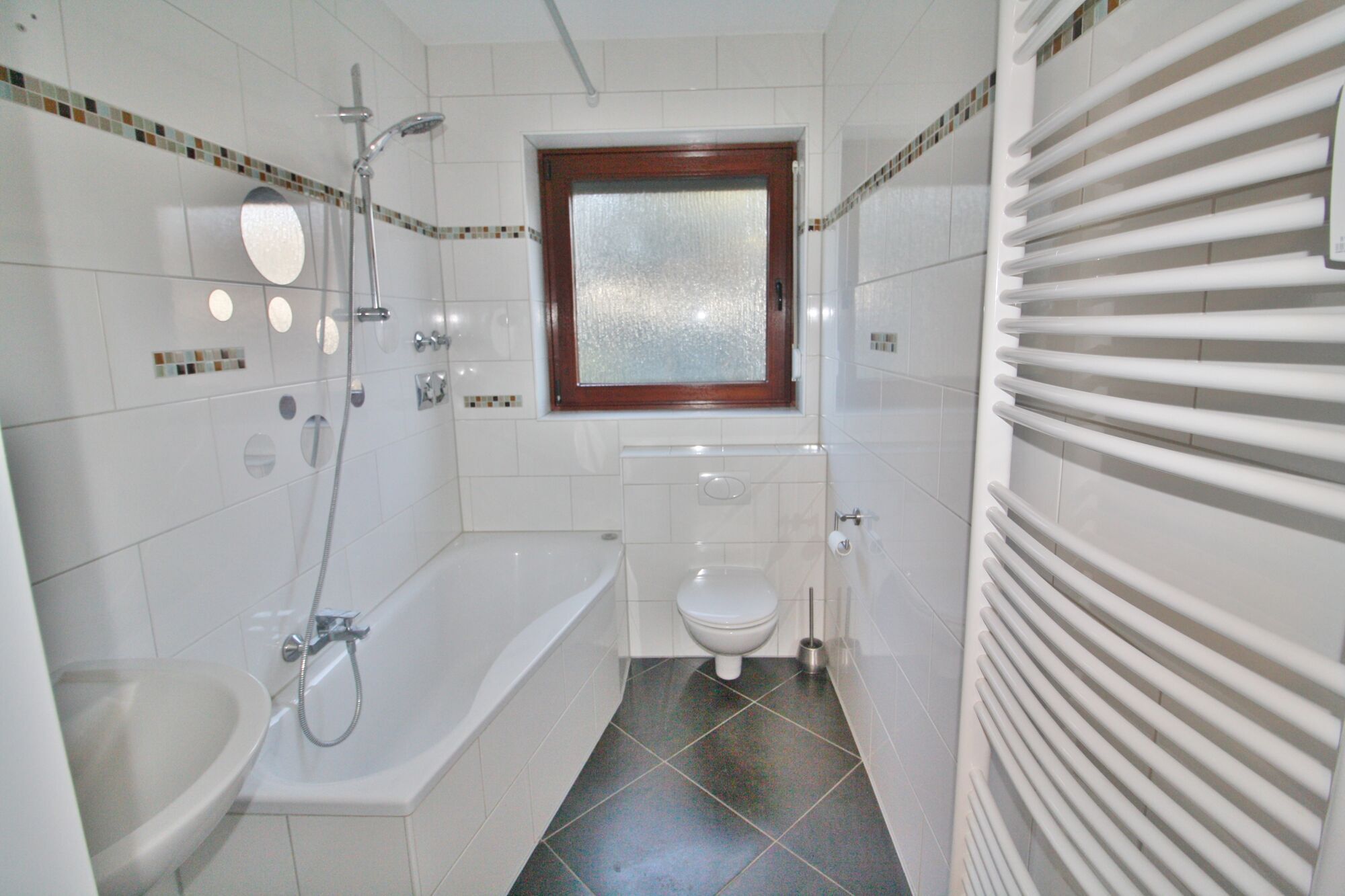 Direkt neben dem Hauseingang befindet sich das Badezimmer, ausgestattet mit einer Badewanne und einem Fenster für die ideale Belichtung und Belüftung des Raumes. Die danebenliegende Küche ist mit einer modernen Einbauküche nebst E-Geräten versehen und wurde stets gut gepflegt. Der gesamte Flur, das Badezimmer sowie die Küche erhielten bei der Modernisierung vor wenigen Jahren die gleichen attraktiven dunklen Bodenfliesen.