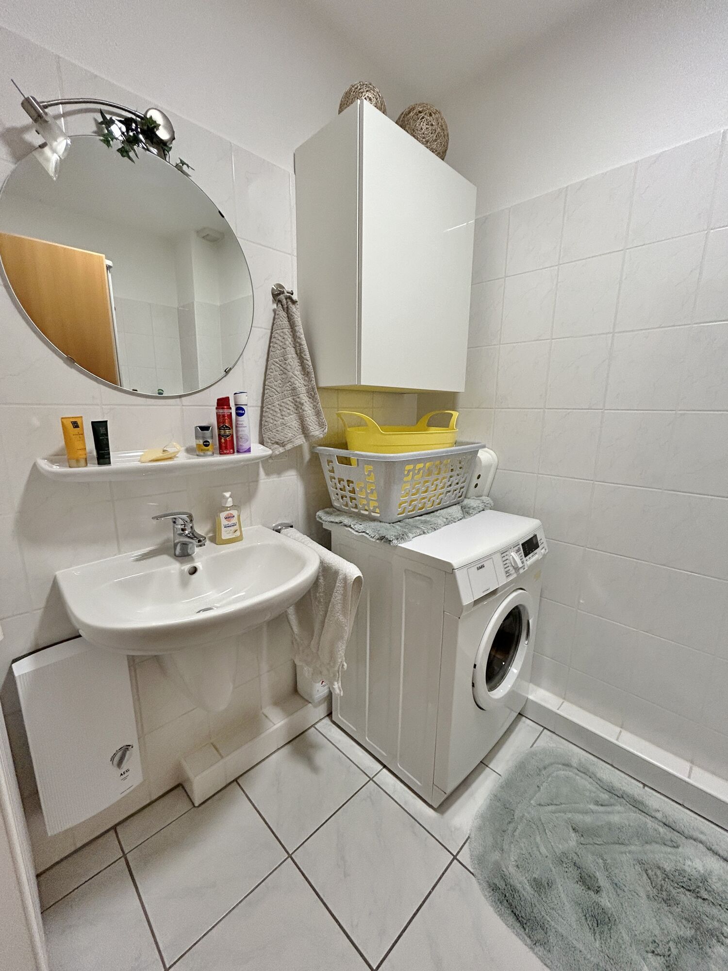 Von der Diele aus ist zudem eines der beiden vorhandenen Duschbädern zu erreichen. Es verfügt über den Anschluss für die Waschmaschine und ist hell und zeitlos gefliest.