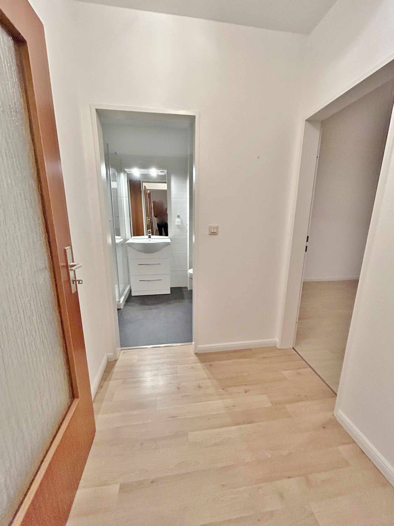 Vom Essbereich abgehend liegt ein kleiner Flur, der den privaten Bereich gut vom Rest der Wohnung abtrennt. Das Bad wurde erst 2022 komplett modernisiert und ist mit einer Dusche ausgestattet und mit hellen Wand- und Bodenfliesen versehen. Der Waschmaschinenanschluss befindet sich ebenfalls im Bad.