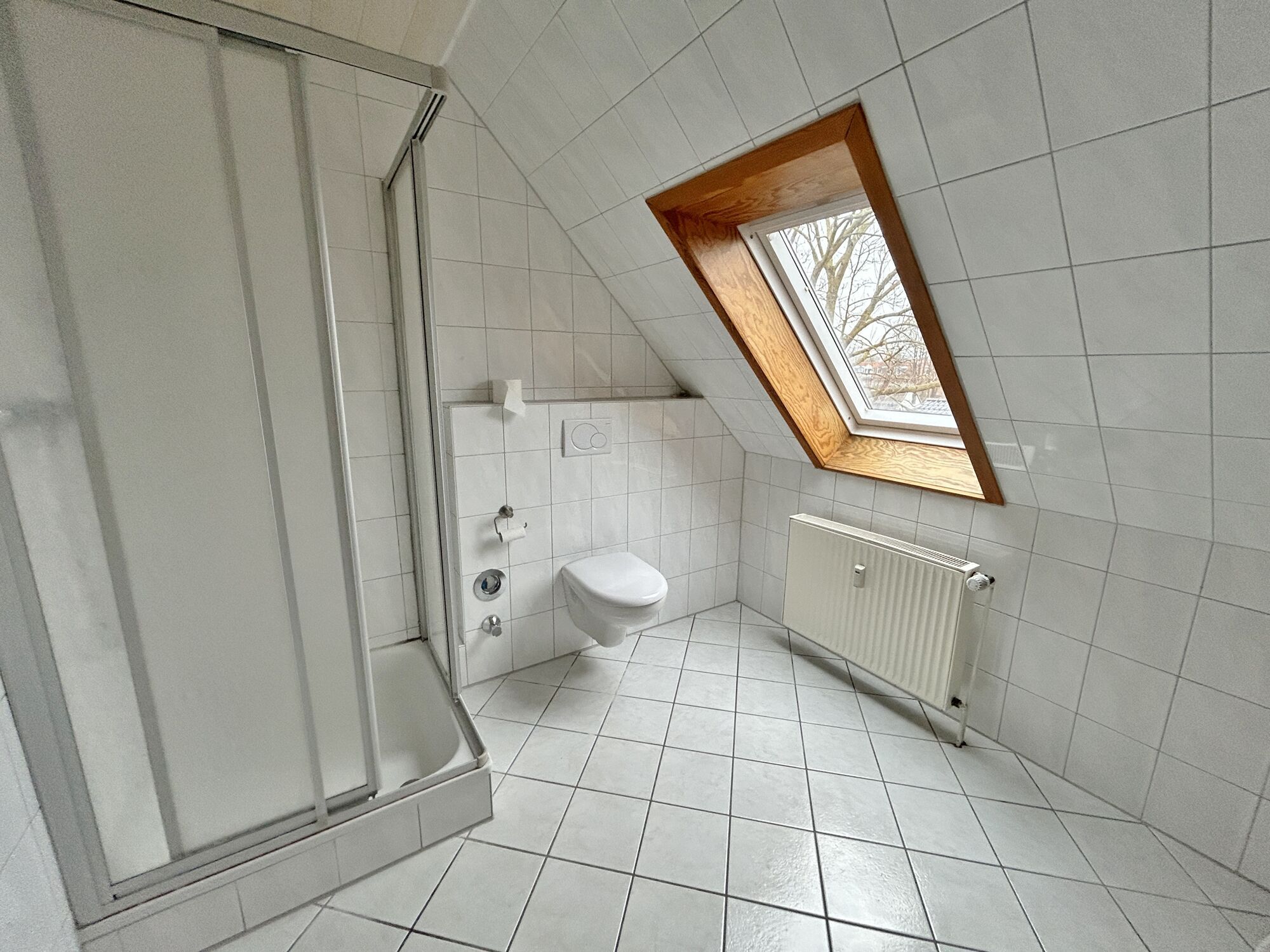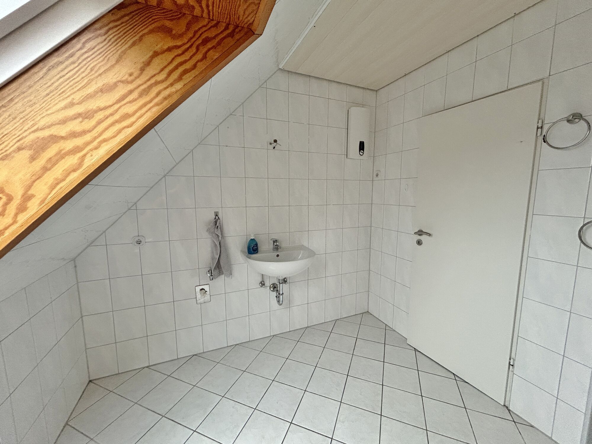 Auf der unteren Ebene befinden sich von einem kleinen Flur abgehend die geräumige Küche, welche bereits mit schlichten Einbauten versehen ist, sowie auch das helle Duschbad mit Waschmaschinenanschluss und Veluxfenster.