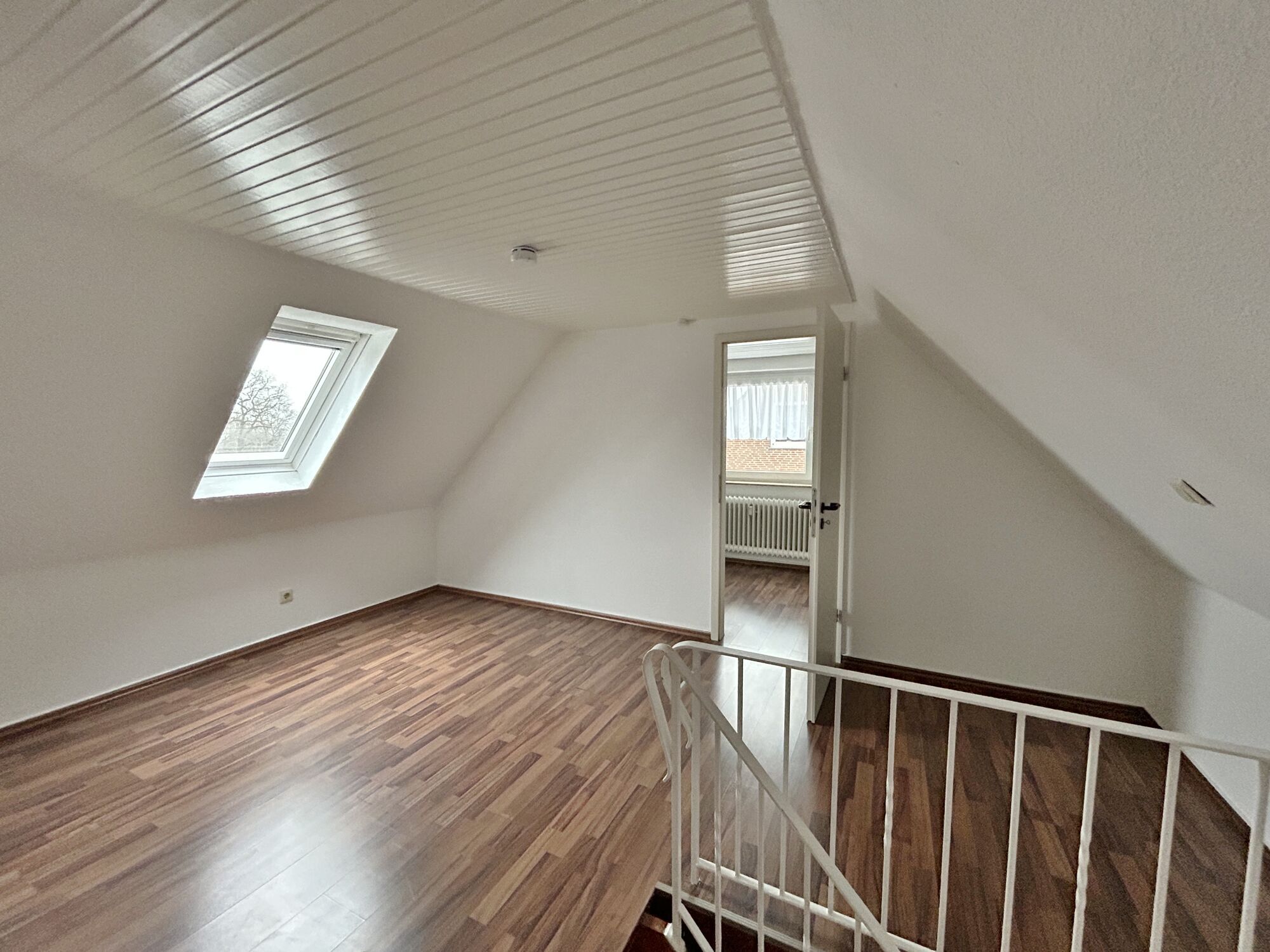Highlight dieser Ebene ist das großzügige Wohnzimmer mit der Treppe ins Dachgeschoss. Hier lassen sich die Wohnlandschaft und ein Esstisch wunderbar stellen. Über die bequem zu begehende Holztreppe gelangt man direkt in das Schlafzimmer. Ein praktischer, weißer Einbauschrank ist bereits vorhanden.