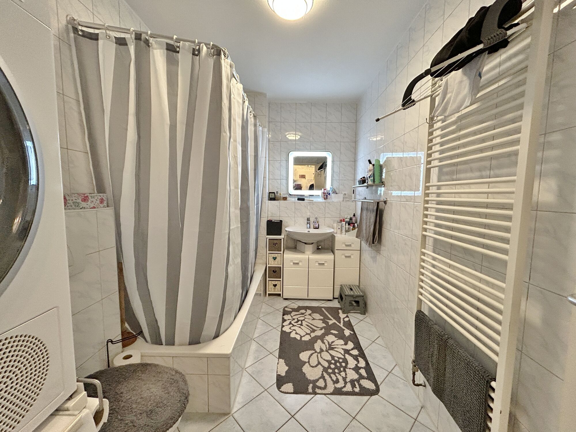 Das innenliegende Badezimmer ist hell gefliest und mit einer Badewanne sowie einem Handtuchheizkörper ausgestattet. Neben dem Waschmaschinenanschluss findet auch ein Trockner hier seinen Platz.