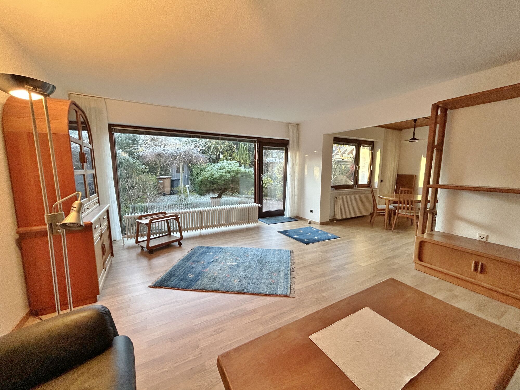 Der Mittelpunkt des Erdgeschosses ist das große Wohnzimmer mit direktem Zugang zur Terrasse. Durch eine Wand etwas separiert hiervon ist der Kochbereich, der bereits mit Einbauten versehen ist. Diese erstrahlen mit wenigen Handgriffen sicher wieder schnell in neuem Glanz. Ein Essbereich vor der Kochzeile rundet das durchdachte Raumangebot ab.