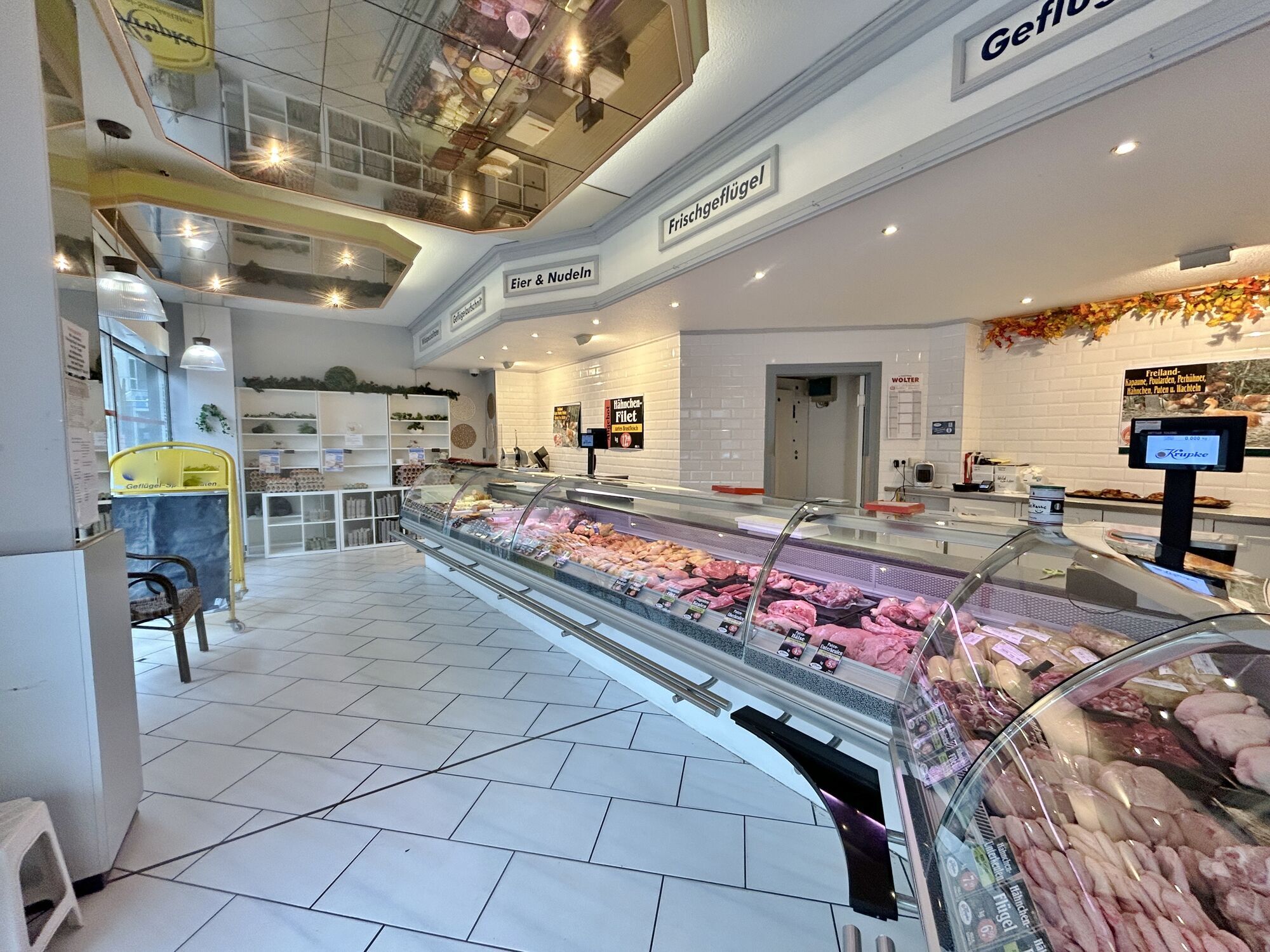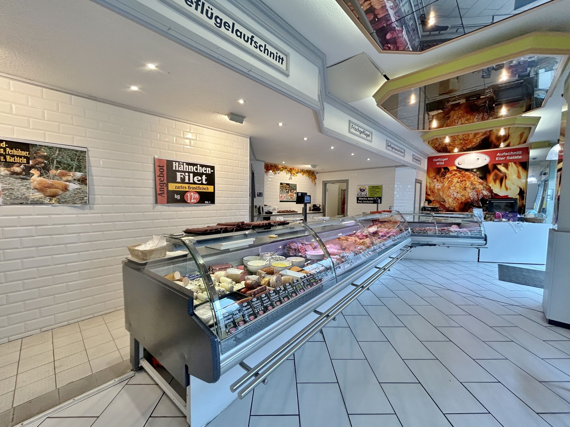 Deckenspots sind über die gesamte Verkaufsfläche verteilt und sorgen für gleichmäßige Beleuchtung.