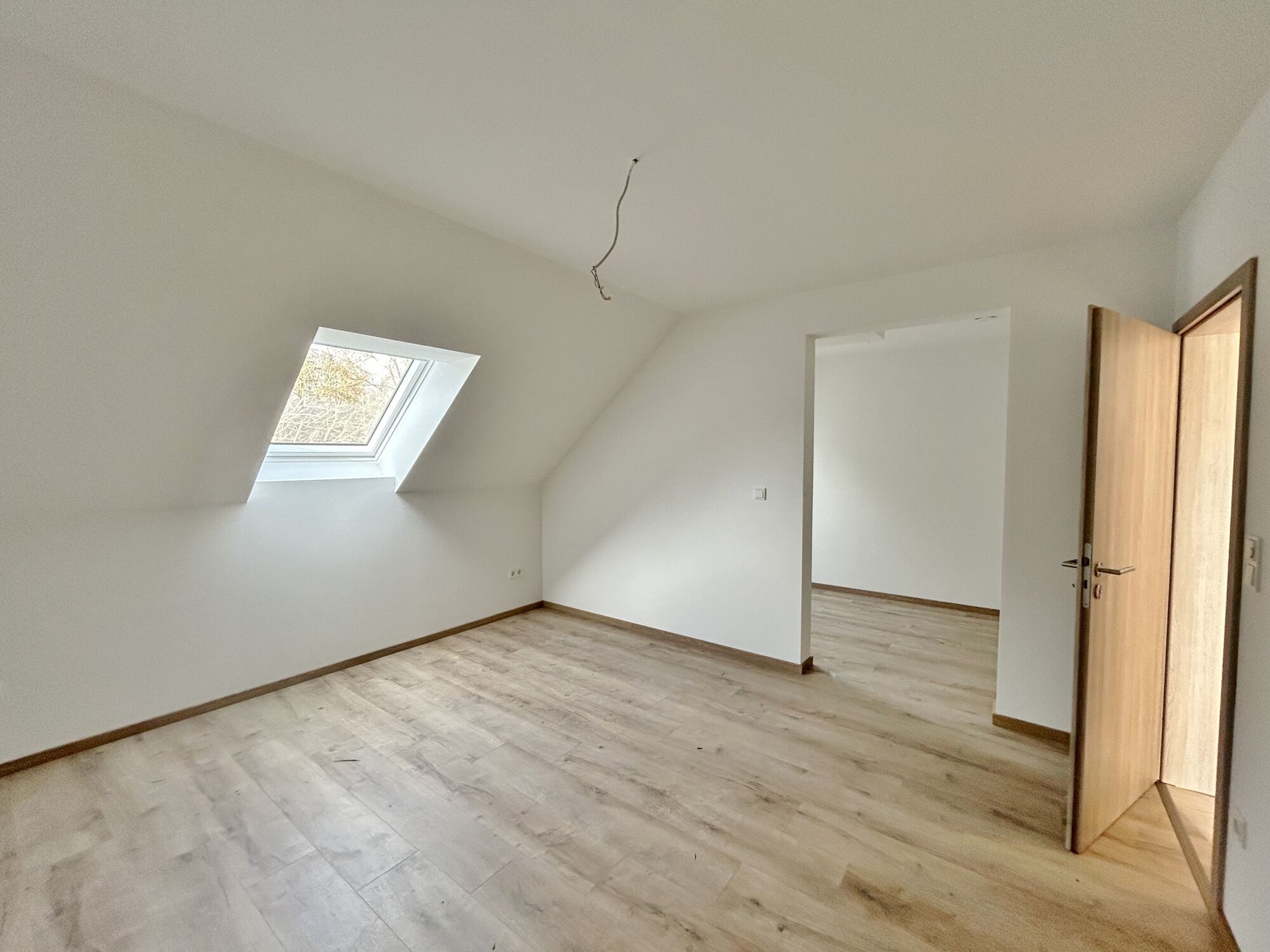 Auch das Obergeschoss kann sich sehen lassen. Das Elternschlafzimmer teilt sich auf in einen Schlafbereich und, etwas abgeteilt, einen Ankleidebereich, in dem alle Klamotten ihren Platz finden. Darüber hinaus im Obergeschoss gelegen sind die beiden Kinderzimmer, welche ebenfalls über eine sehr reelle Größe verfügen und sich daher auch mit Schrägen gut möblieren lassen.