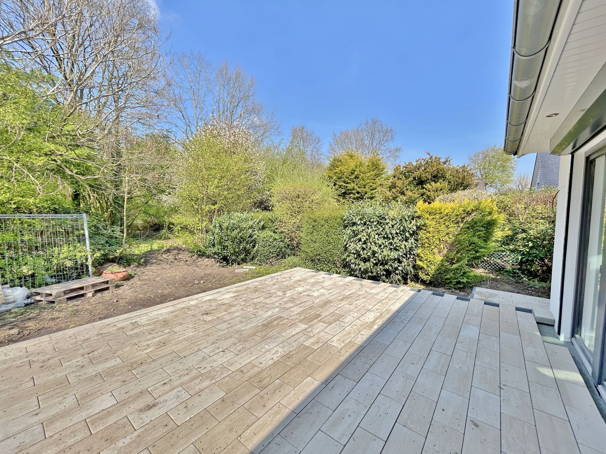 Der Wohn-/ und Essbereich wird durch die ehemalige Außenmauer etwas geteilt und bietet grenzenlose Gestaltungsmöglichkeiten. Der neue Anbau verfügt als besonderen Hingucker über Spots im Träger, sowie Glaselemente im Dach, die das Maximum an Licht ermöglichen. Von hier aus haben Sie Zugang zur rückwärtigen Terrasse mit West-Ausrichtung. Der Garten wird vor Einzug neu angelegt und grenzt an das Biotop, wodurch Sie einen wunderschönen Ausblick ins Grüne haben. Ein kleines Plus für Apfelkuchen-Fans: im Garten haben Sie Ihren eigenen Apfelbaum.