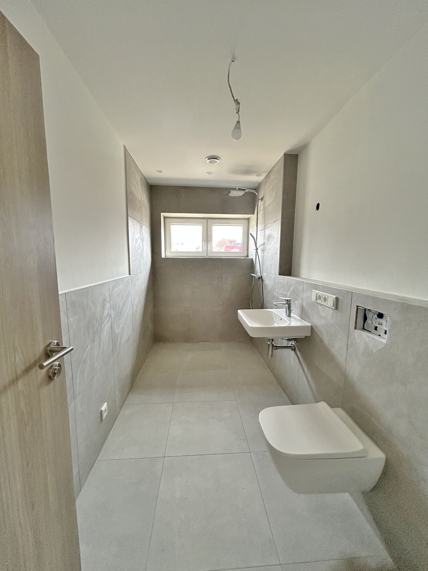 Daran angrenzend ist das Badezimmer gelegen. Durch großformatige Fliesen spiegelt sich ein modernes Design wider, welches sich auch in der ebenerdigen Dusche abbildet. Nicht nur hier im Bad, sondern im gesamten Haus begegnet Ihnen Dank der Fußbodenheizung eine angenehme Fußwärme.