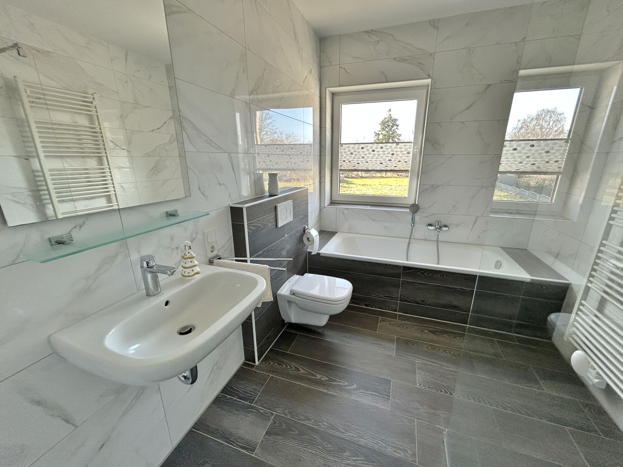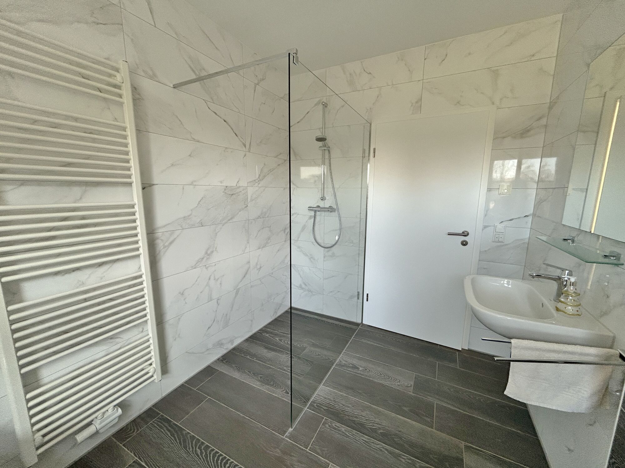 Das moderne Badezimmer ist sowohl mit einer ebenerdigen Dusche als auch mit einer Badewanne ausgestattet und bietet Ihnen einen komfortablen Rückzugsort. Die hochwertigen Armaturen und die stilvolle Gestaltung schaffen eine ansprechende Wellness-Oase. Ein besonderes Highlight neben den großformatigen Fliesen ist auch der Handtuchheizkörper.