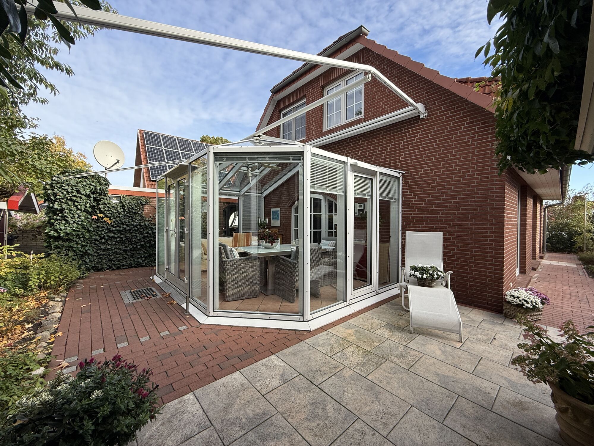 - beheizter Wintergarten mit Innenjalousien sowie Beschattung (Markise)