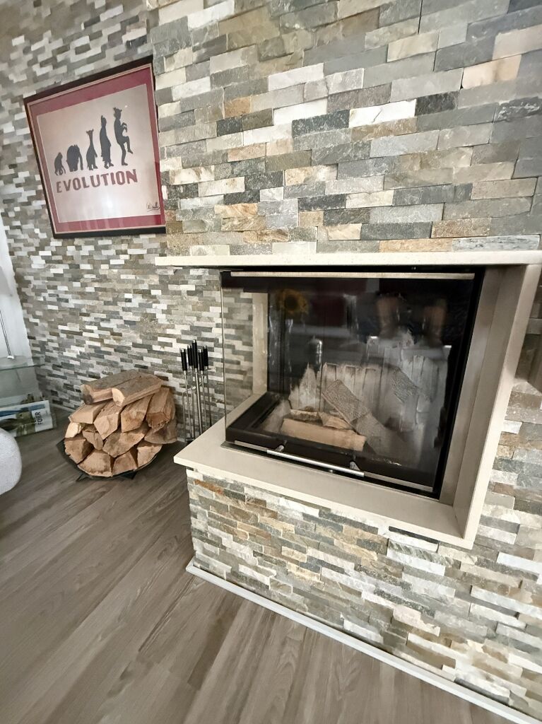 Das L-förmig gestaltete Wohn- und Esszimmer schafft eine klare Trennung zwischen den Bereichen. Der Essplatz bietet Raum für gesellige Runden, während im Wohnbereich der Kamin für wohlige Wärme sorgt.