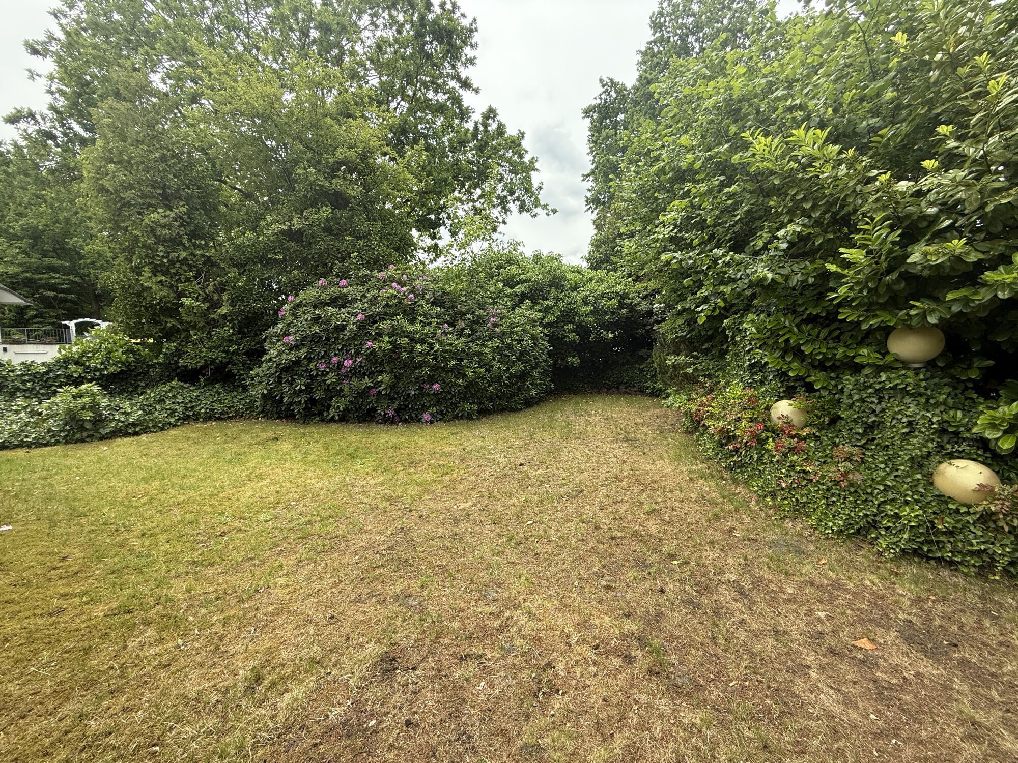 Der Garten ist pflegeleicht mit Rasenfläche und Beeten angelegt und bietet viel Platz für Kinder, Hobbygärtner oder ruhige Stunden im Freien. Eine Zufahrt zur Garage befindet sich auf der rechten Seite des Hauses und führt über einen Carport.