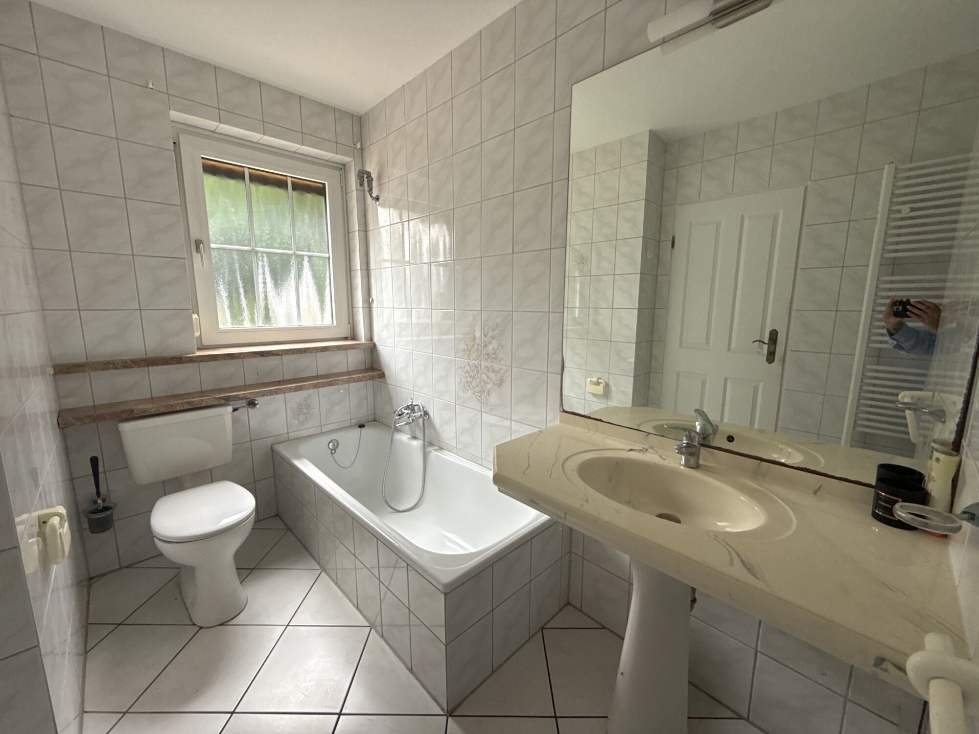 Das Wohnzimmer ist mit einer breiten, bodentiefen Fensterfront ausgestattet, die den Raum mit viel Licht durchflutet. Von hier aus können Sie die geschützte Terrasse im Westen betreten – der perfekte Ort, um den wohl verdienten Feierabend zu genießen. Da am Wohnzimmer direkt das ursprüngliche Elternschlafzimmer angrenzt, wurde die Wand geöffnet und es entstand ein zusätzliches Esszimmer.