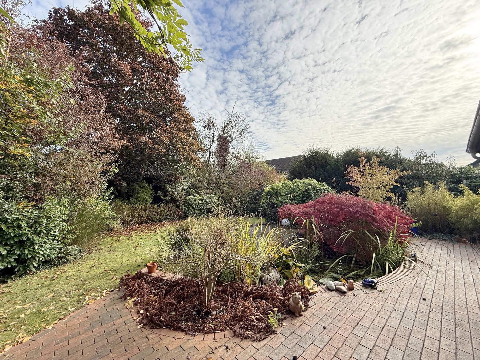 Der sonnige, uneinsehbare Garten ist liebevoll gestaltet und mit einem kleinen Teich versehen – perfekt zum Entspannen, Spielen und Genießen. Ein Carport bieten Platz für Ihr Fahrzeug. Die vorhandene Garage wurde zu einem Astellraum/Schuppen umfunktioniert.
