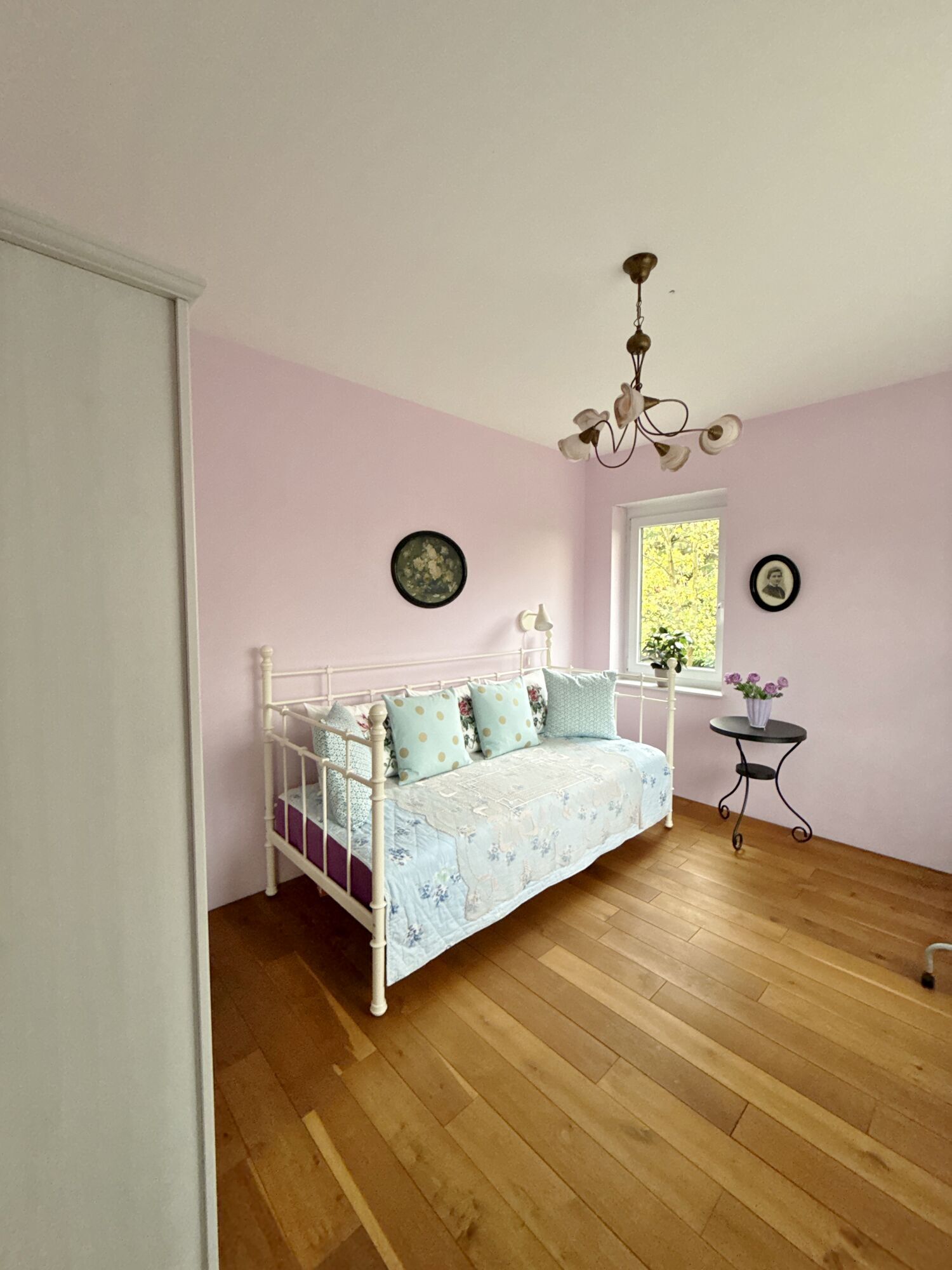 Über eine offene Vollholztreppe aus Buche gelangen Sie ins Obergeschoss. Hier erwarten Sie zwei fast identisch große Kinderzimmer sowie ein weiteres Gäste- oder Arbeitszimmer.