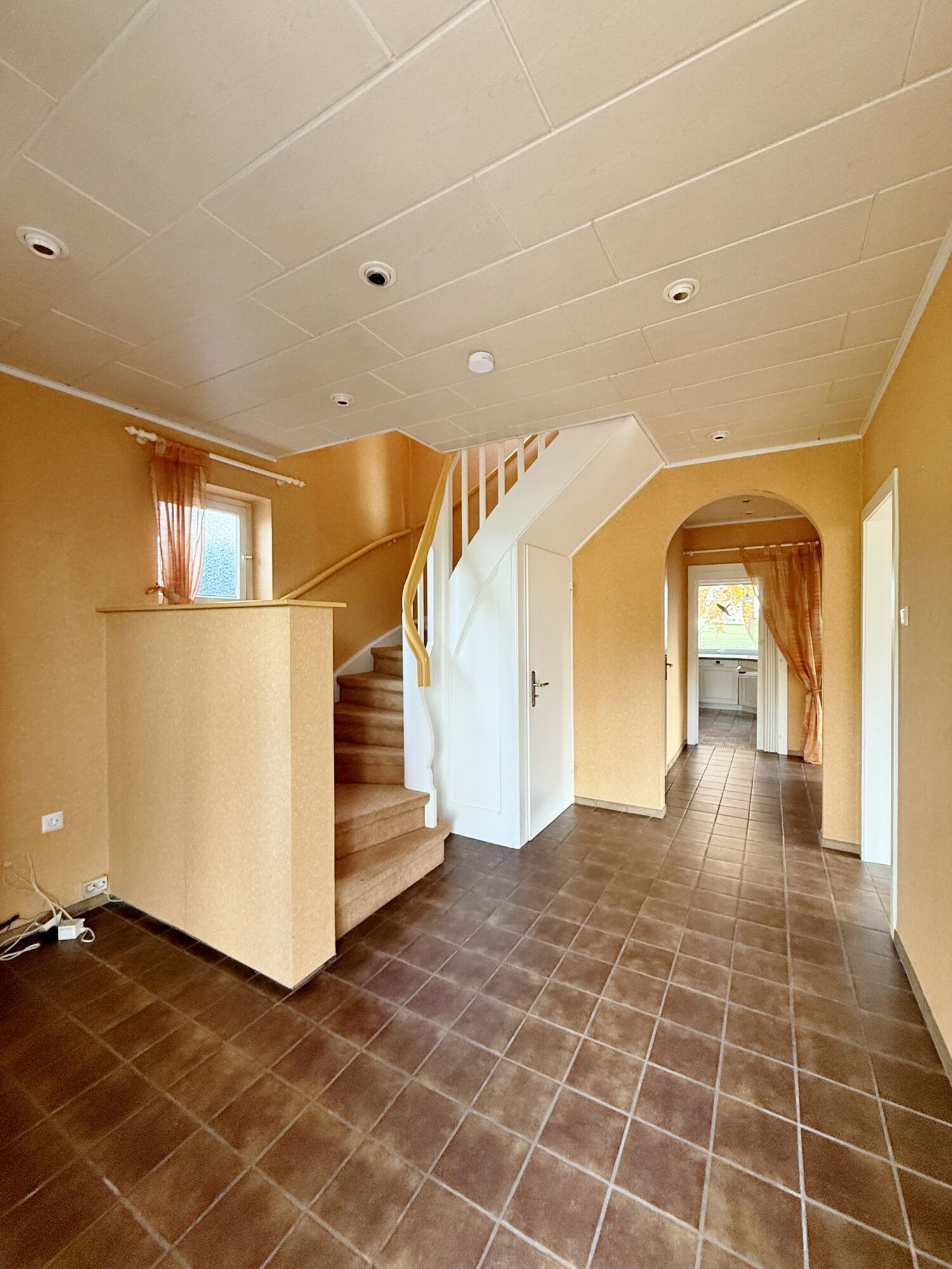 Über den gepflegten, gepflasterten Hof erreichen Sie den einladenden Hauseingang. Der großzügige Eingangsbereich bietet viel Platz für Ihre Garderobe und vermittelt mit seinen braunen Bodenfliesen, den weiß vertäfelten Decken mit integrierten Spots sowie der warmen Farbgestaltung eine angenehme, wohnliche Atmosphäre.