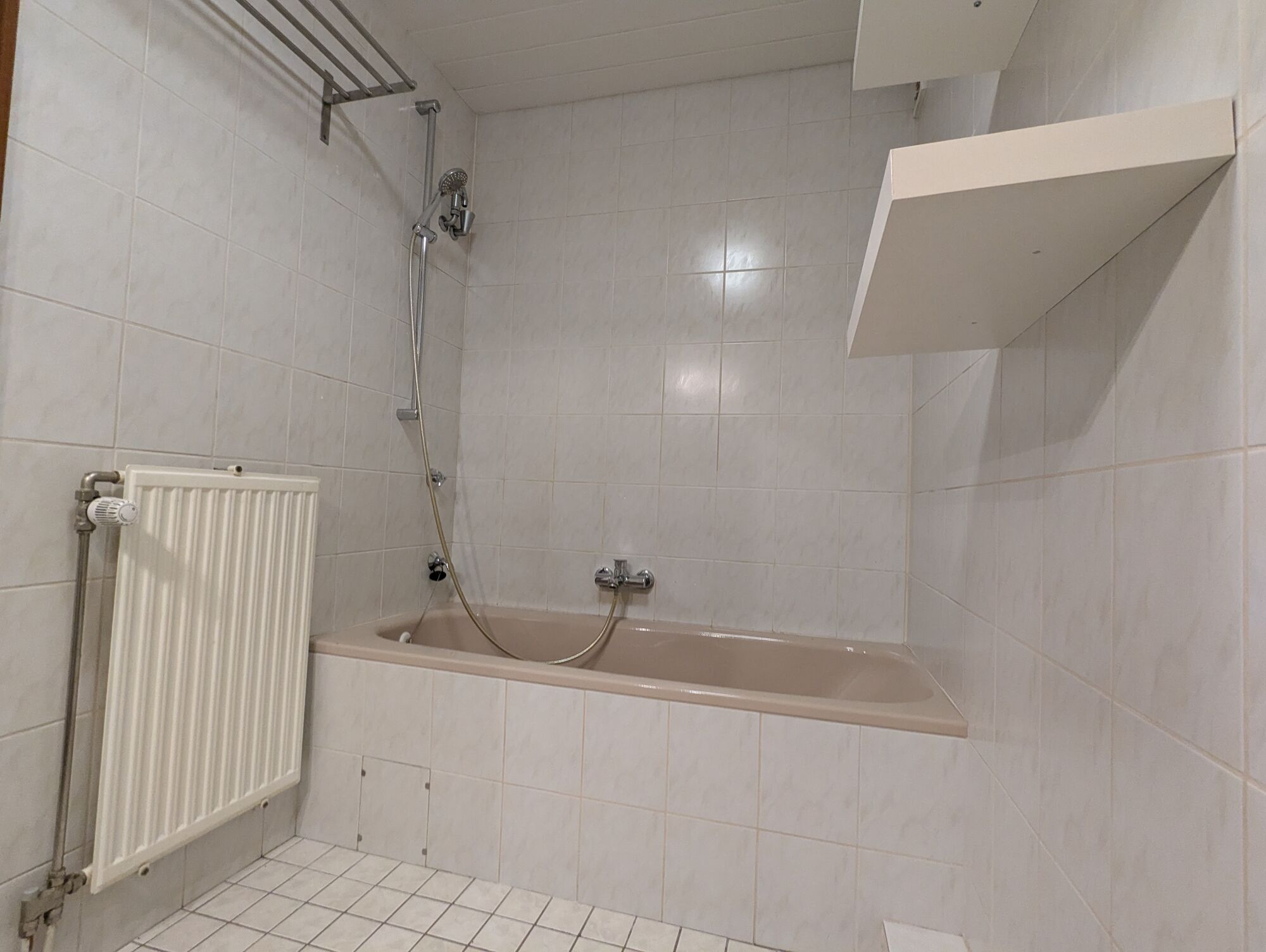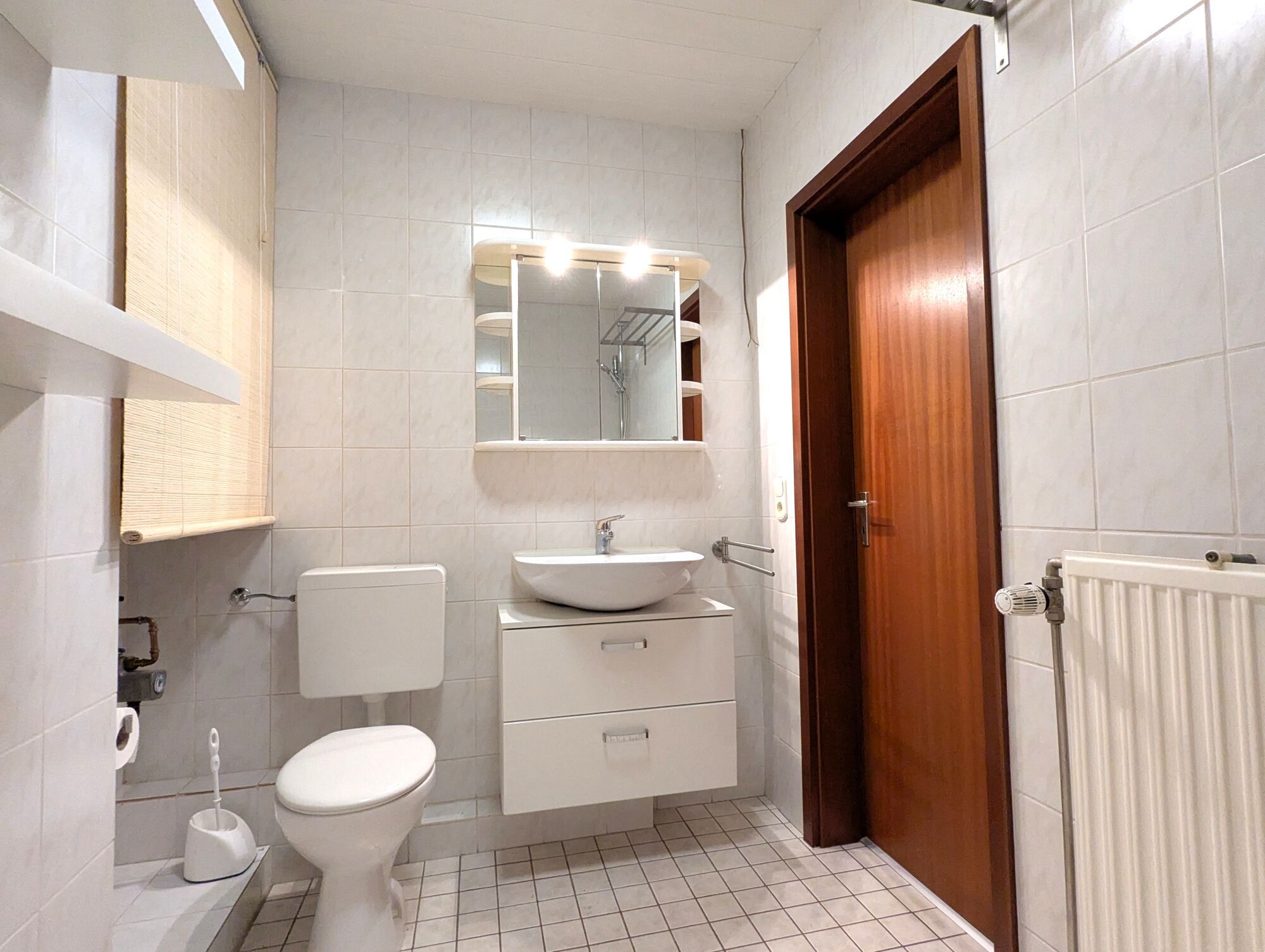 - weiße Fliesen in Bad und Küche