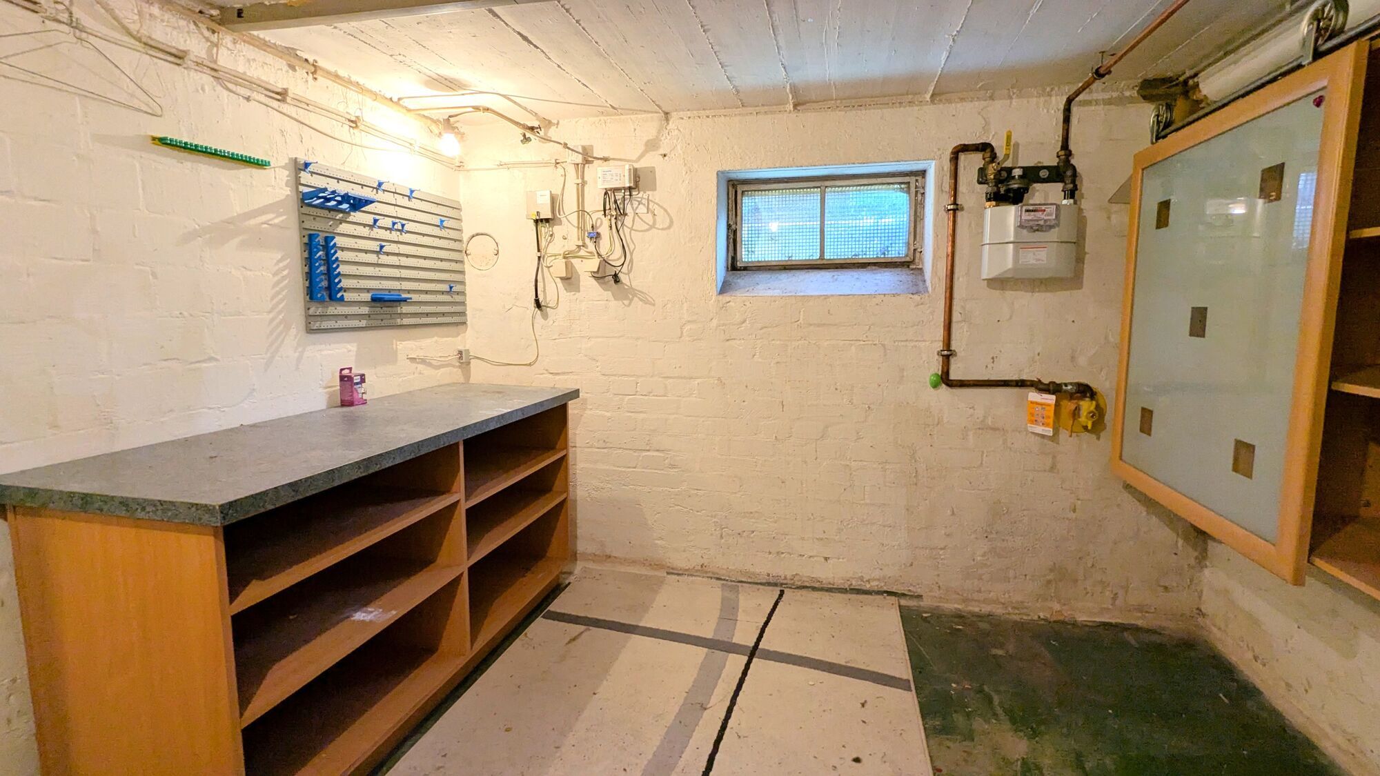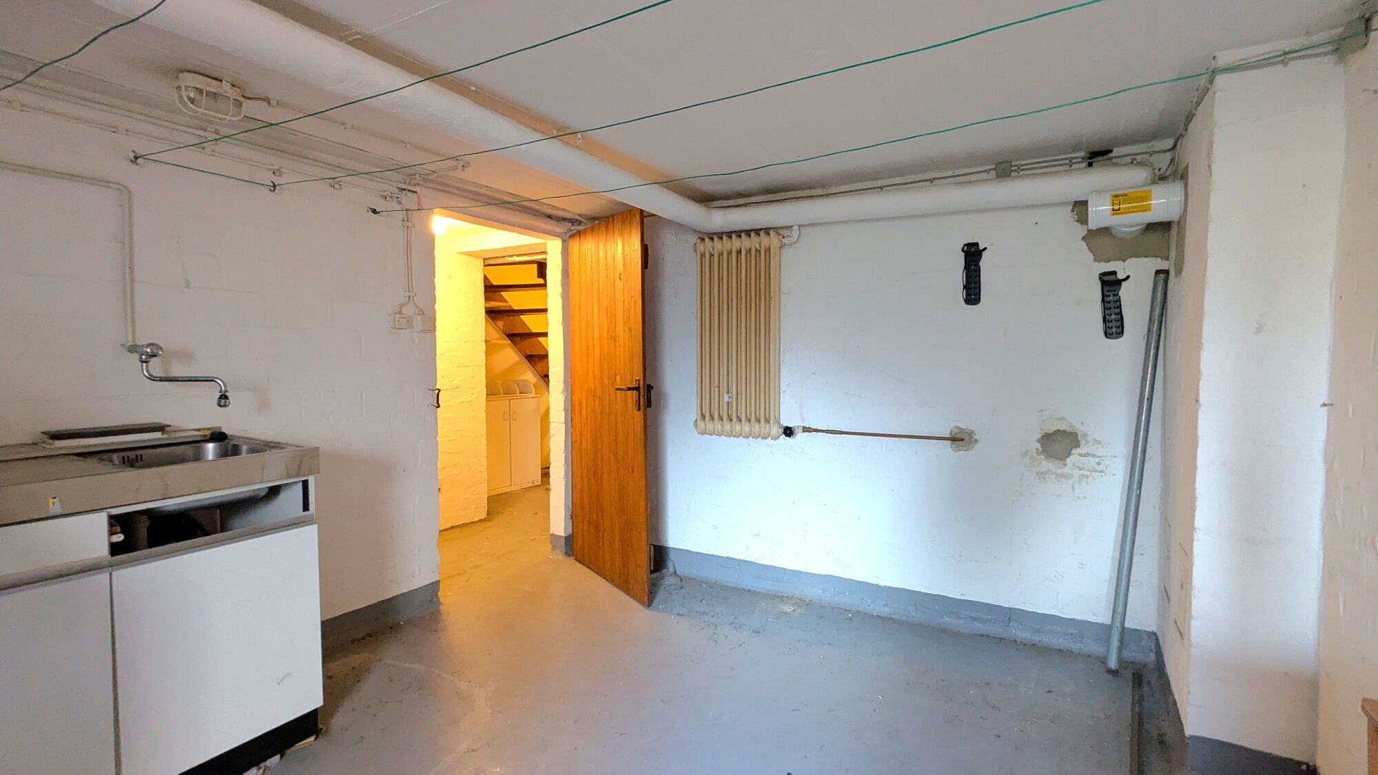 Der Vollkeller ist direkt vom Erdgeschoss aus begehbar und bietet reichlich Abstell- und Nutzfläche. Hier befinden sich eine Werkstatt, mehrere Abstellräume sowie ein weiteres WC. Ein separater Außenzugang ist ebenfalls vorhanden – ideal für Hobbyhandwerker oder als Zugang zum Garten.