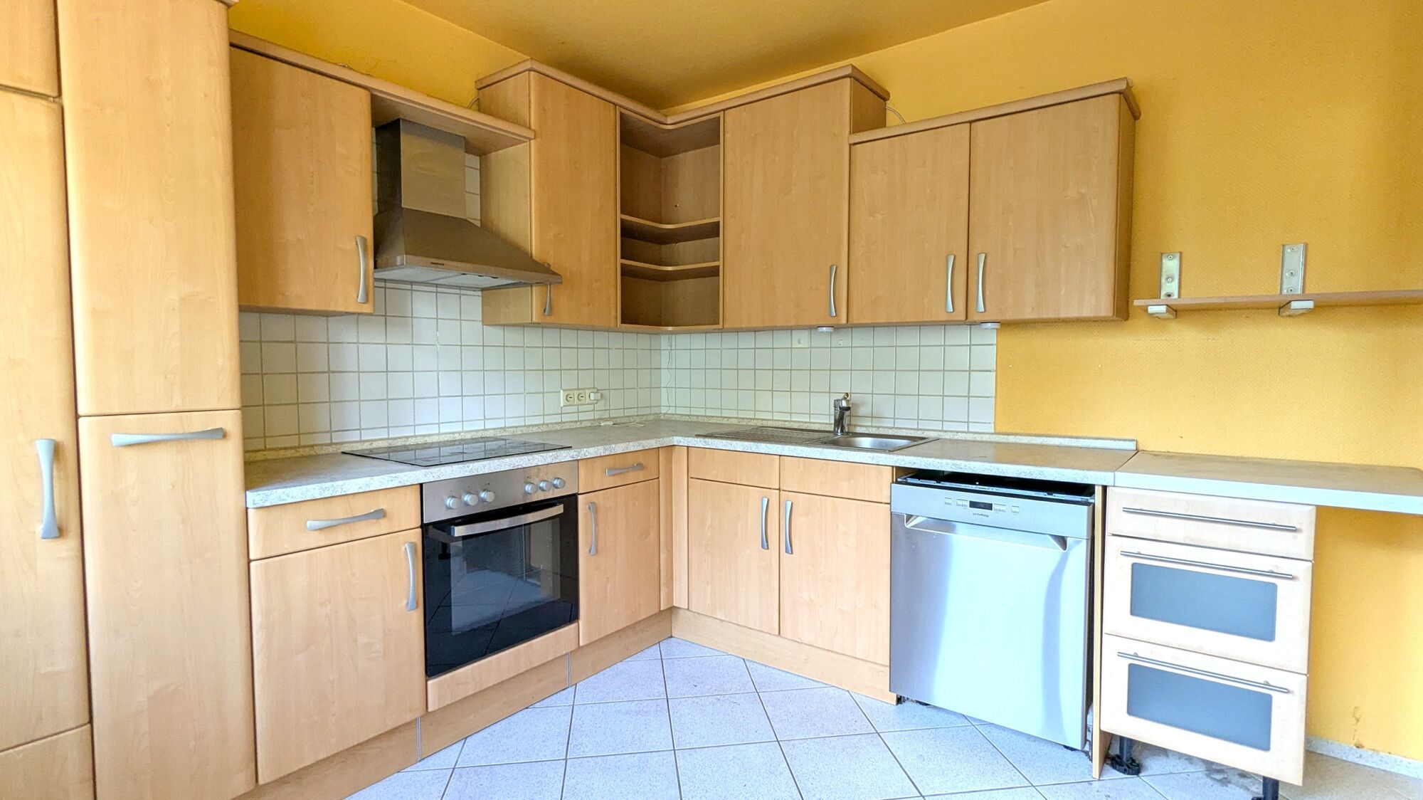 Der Eingangsbereich empfängt Sie mit einem kleinen Flur, von dem aus Sie direkt in die Küche gelangen. Diese ist mit einer klassischen Einbauküche in Buche-Optik ausgestattet und bietet Platz für einen gemütlichen Essbereich.