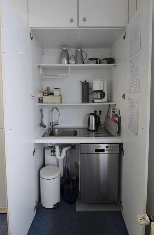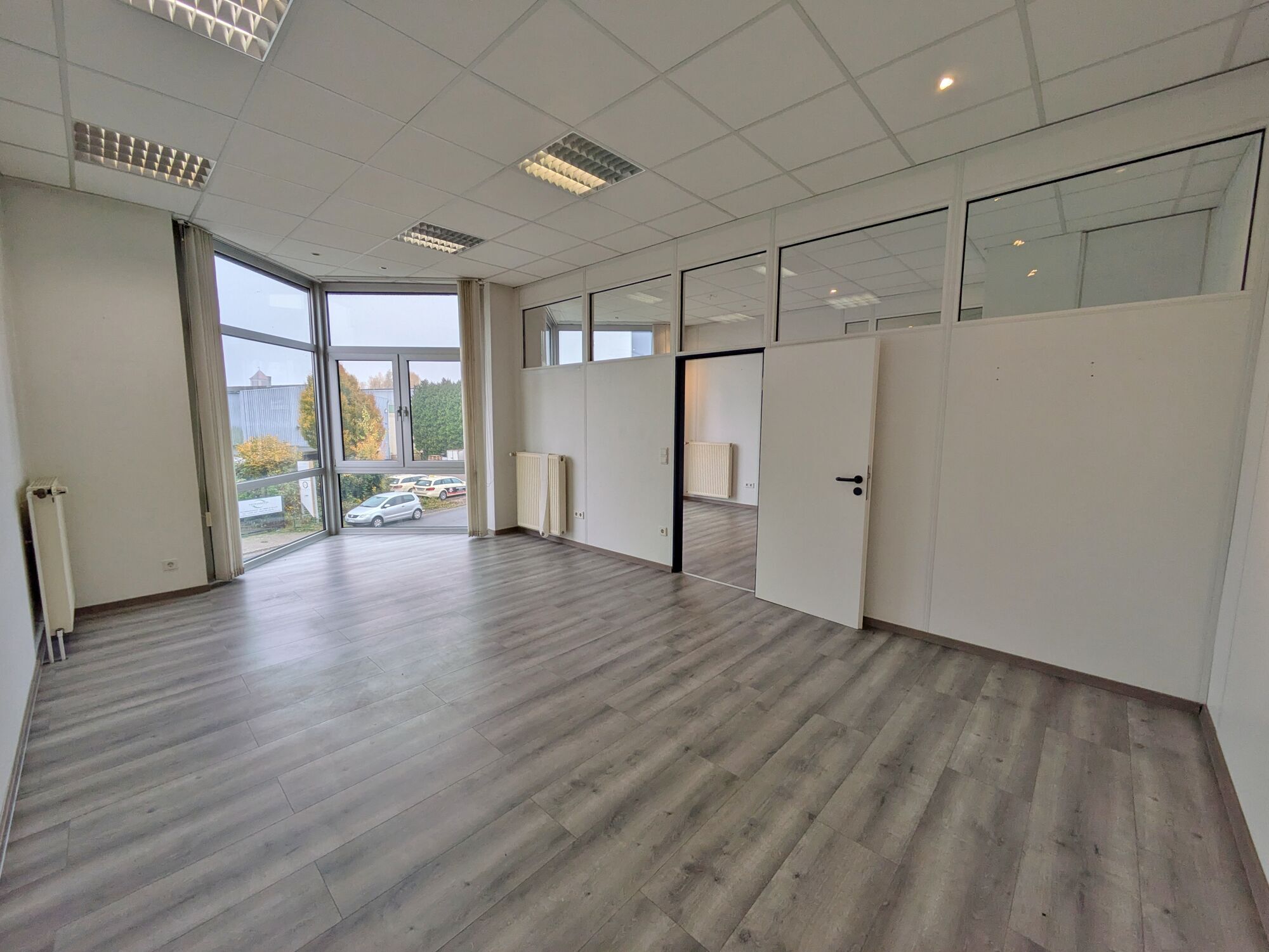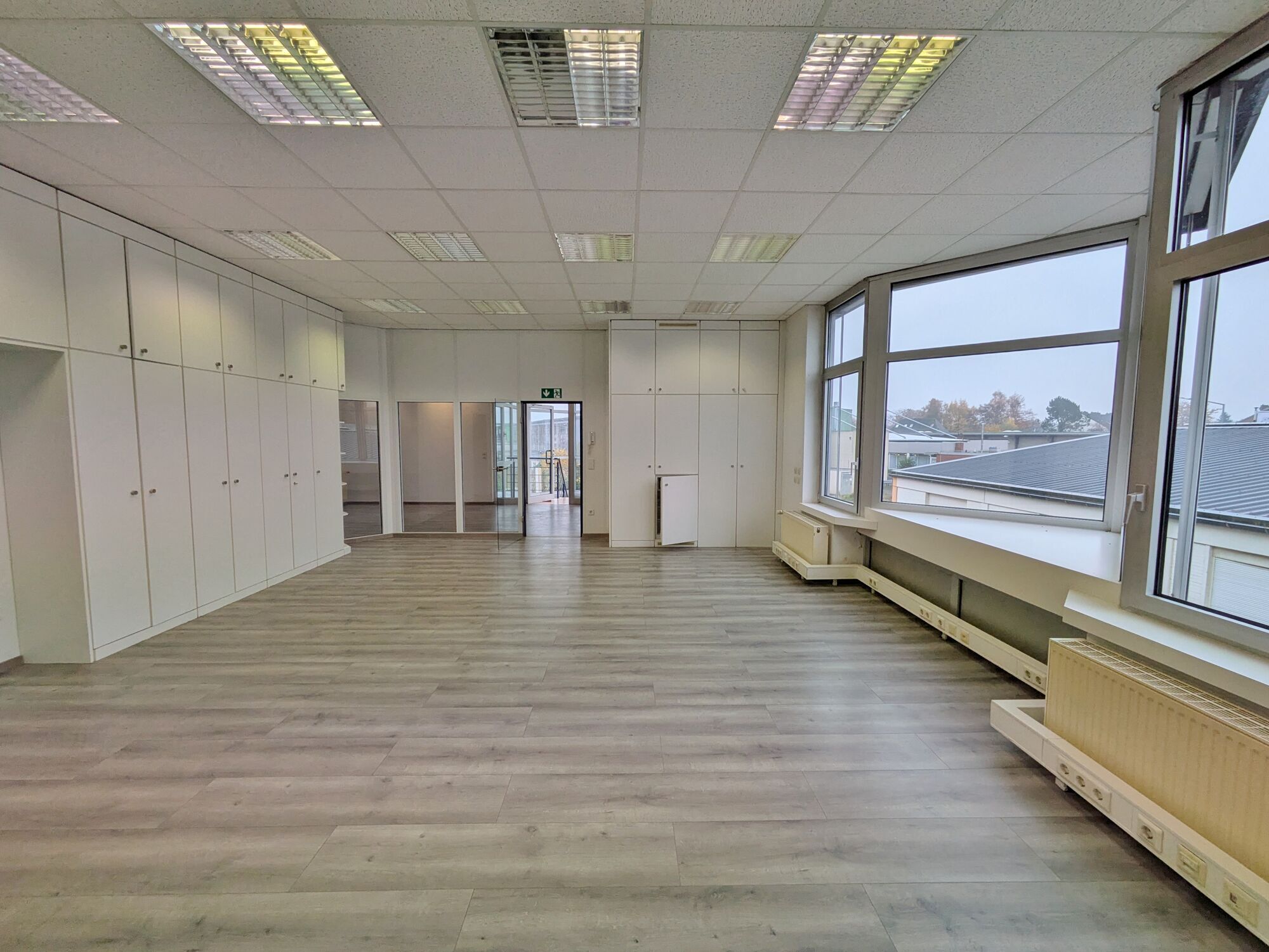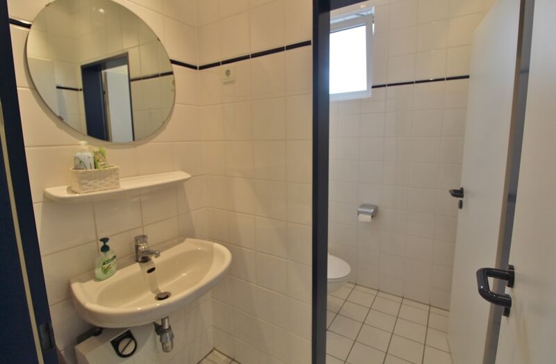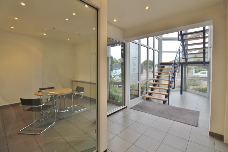 Die Büroräume zur Vorderseite des Gebäudes sind über einen zentralen Flur zugänglich, wobei der vierte Raum über den Besprechungsraum erreicht wird. Alle Büroräume sind mit Laminatboden ausgestattet. Zwei der Räume bieten zusätzlich helle Einbauschränke. Auf dieser Etage stehen separate Damen- und Herren-WCs zur Verfügung.